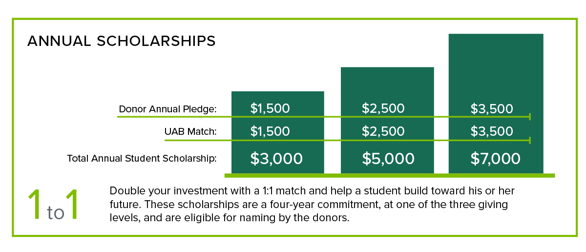 Through your participation in this initiative with UAB, you can double the financial impact for students. You can choose to invest in an annual or endowed scholarship at various levels, which will allow UAB to recruit and retain talented individuals.