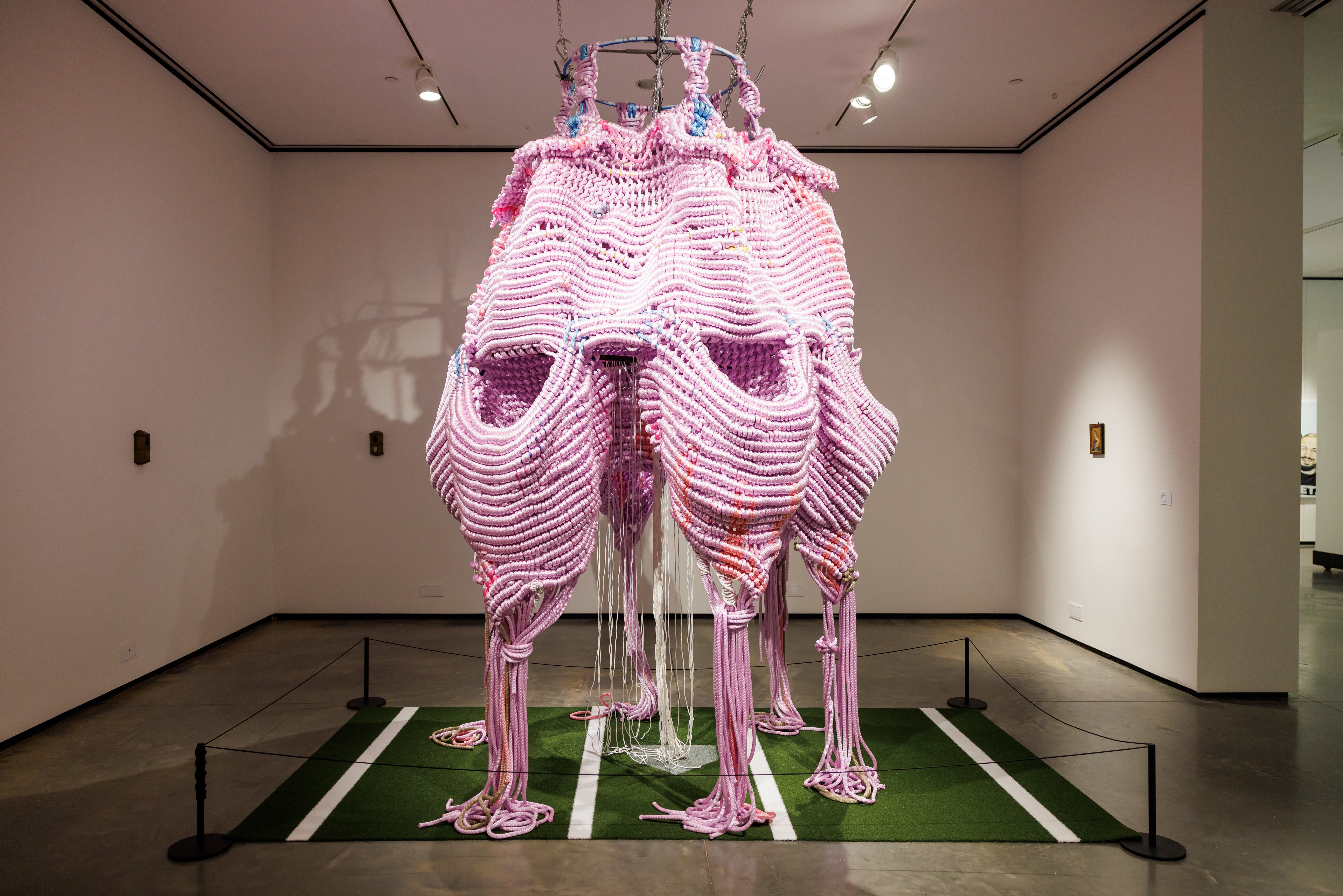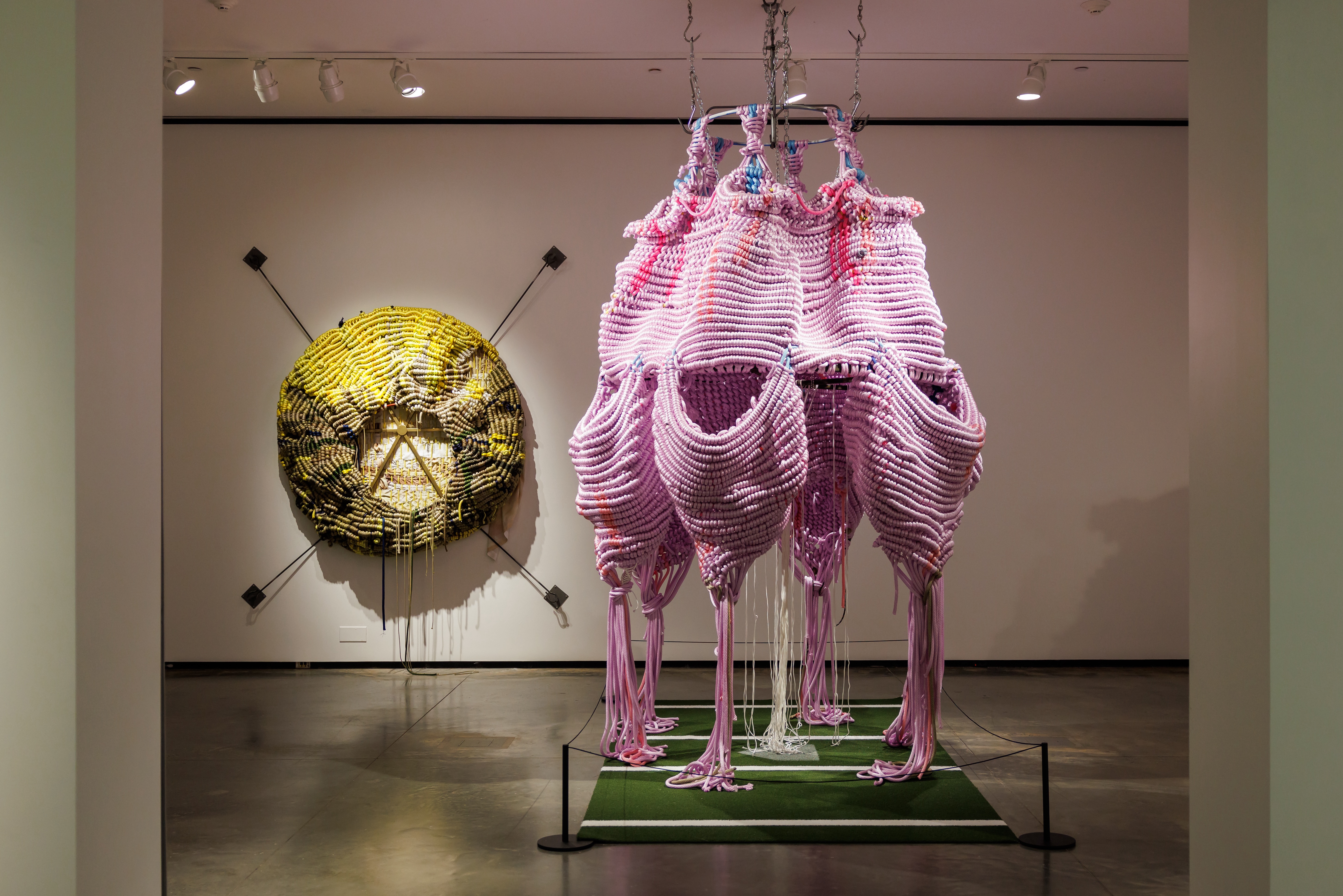 Jacqueline Surdell’s primary tool is her body. Systems of play, discipline, and pressure generate sculptures born from hand-manipulating dock cord, knotting and weaving lines into naturalistic forms that appear like nests, built by and for the body. Her creatures and their enclosures bind together themes of memory, identity, and the human experience. Playing competitive volleyball for ten years taught Surdell how to identify and utilize the primal matter of energy, space, and momentum. Her works trace her family history and private life while fostering discussion around labor, gender, and sexuality.