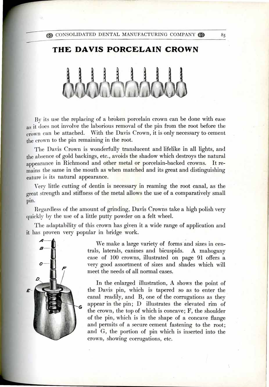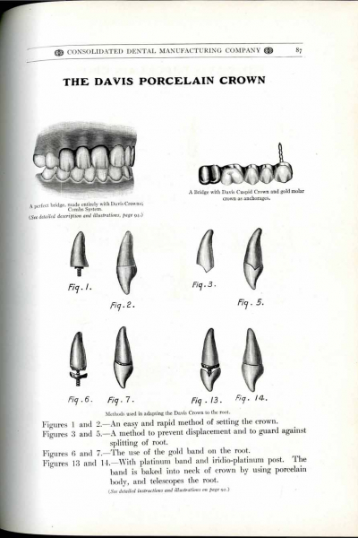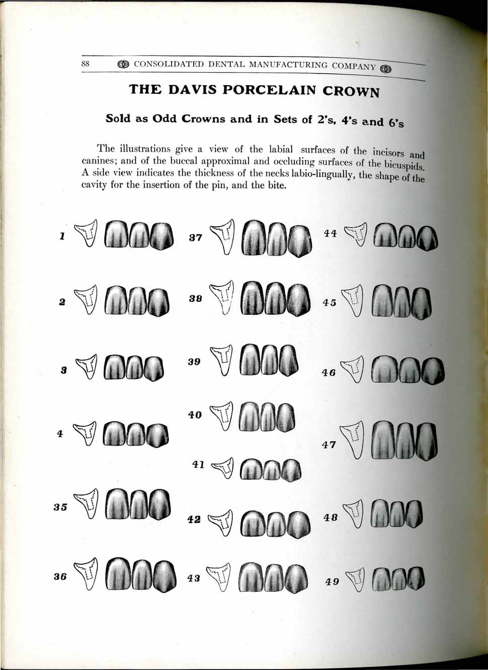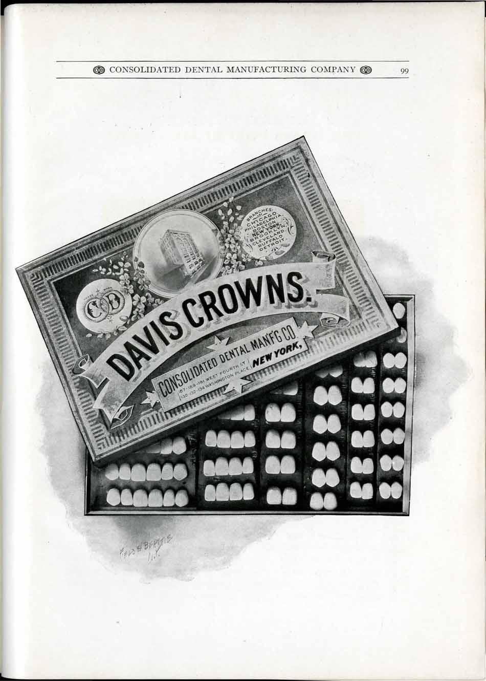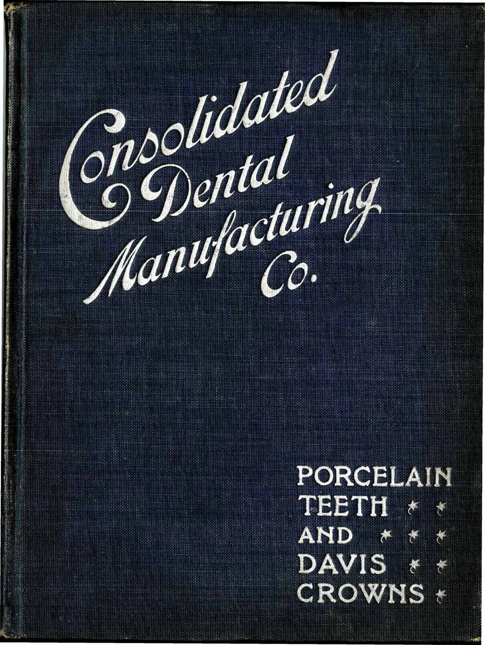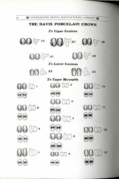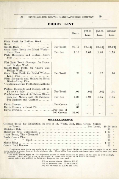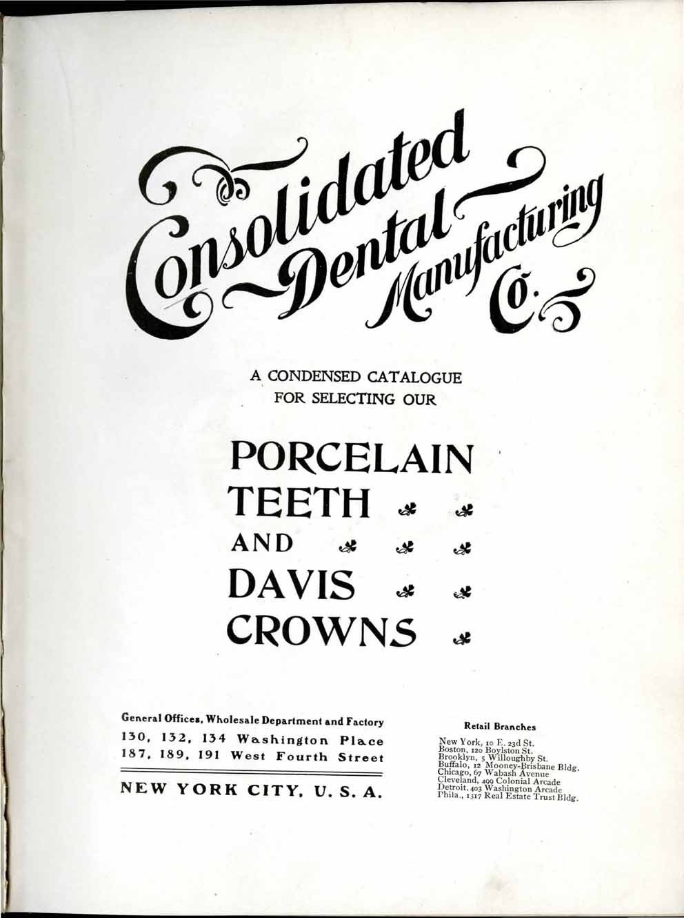 1904 catalogue of artificial teeth and Davis crowns from Consolidated Dental Manufacturing Co., including drawings, detailed descriptions, and price lists.