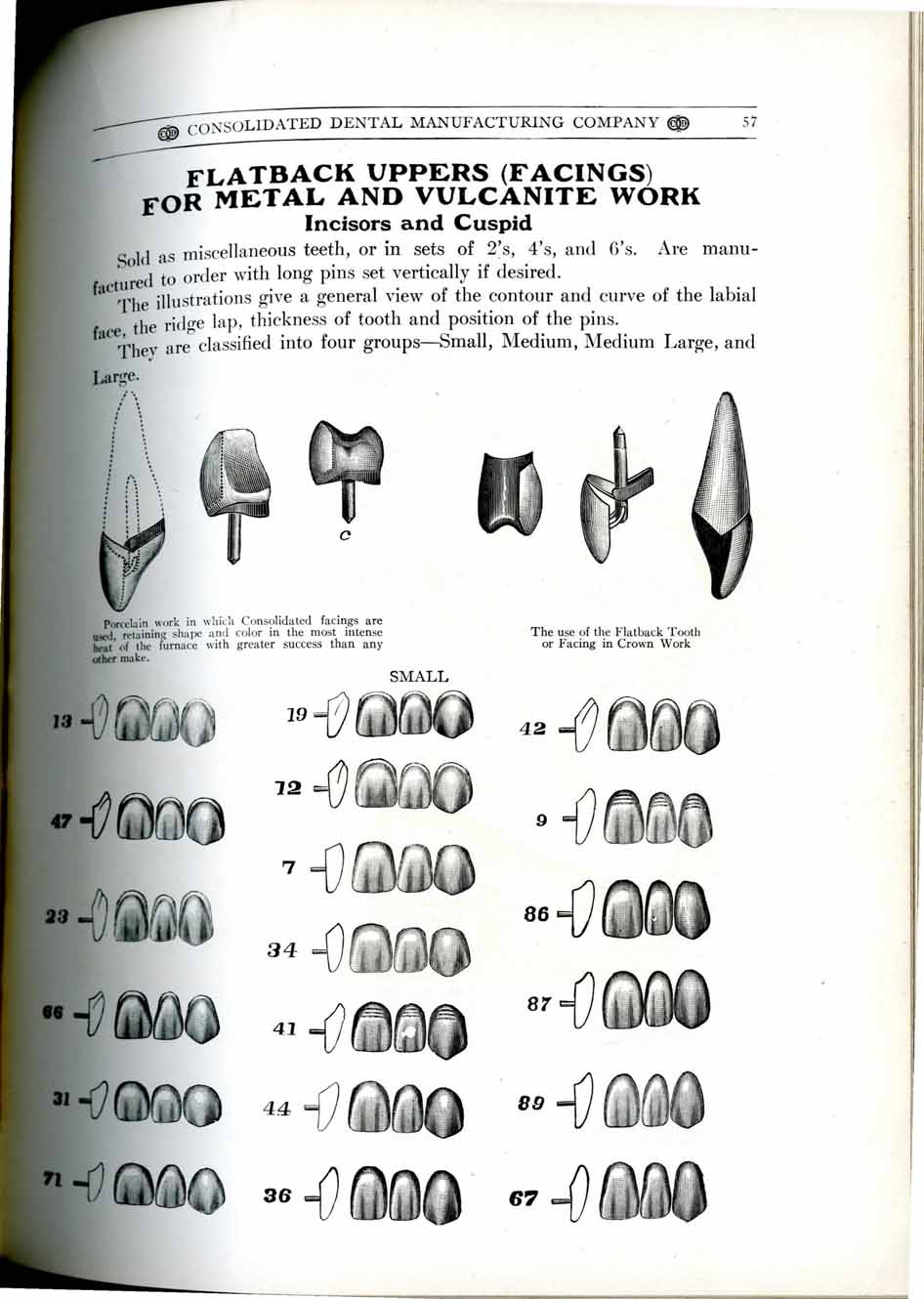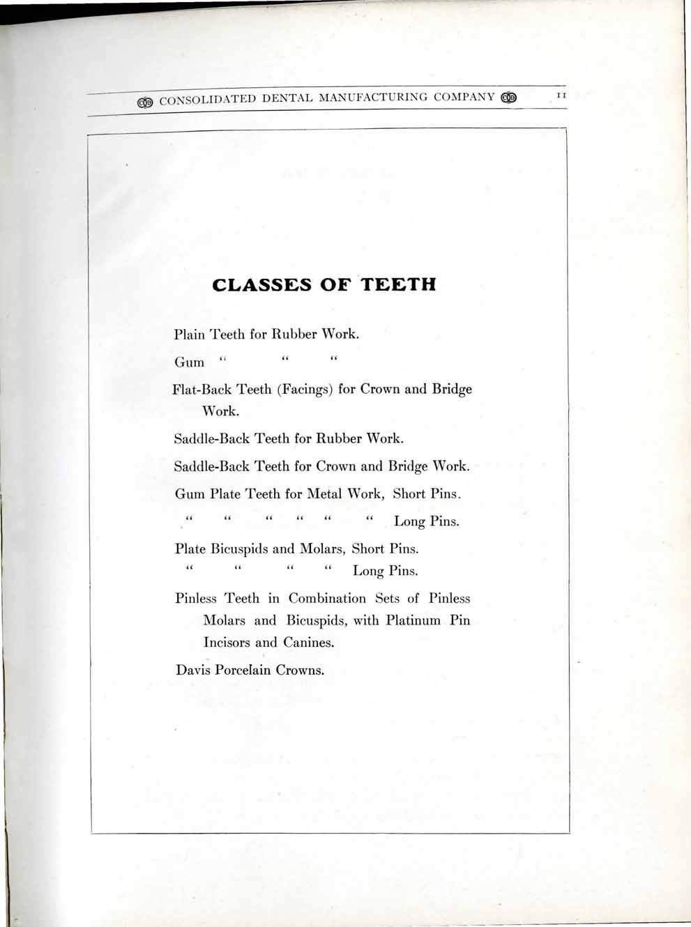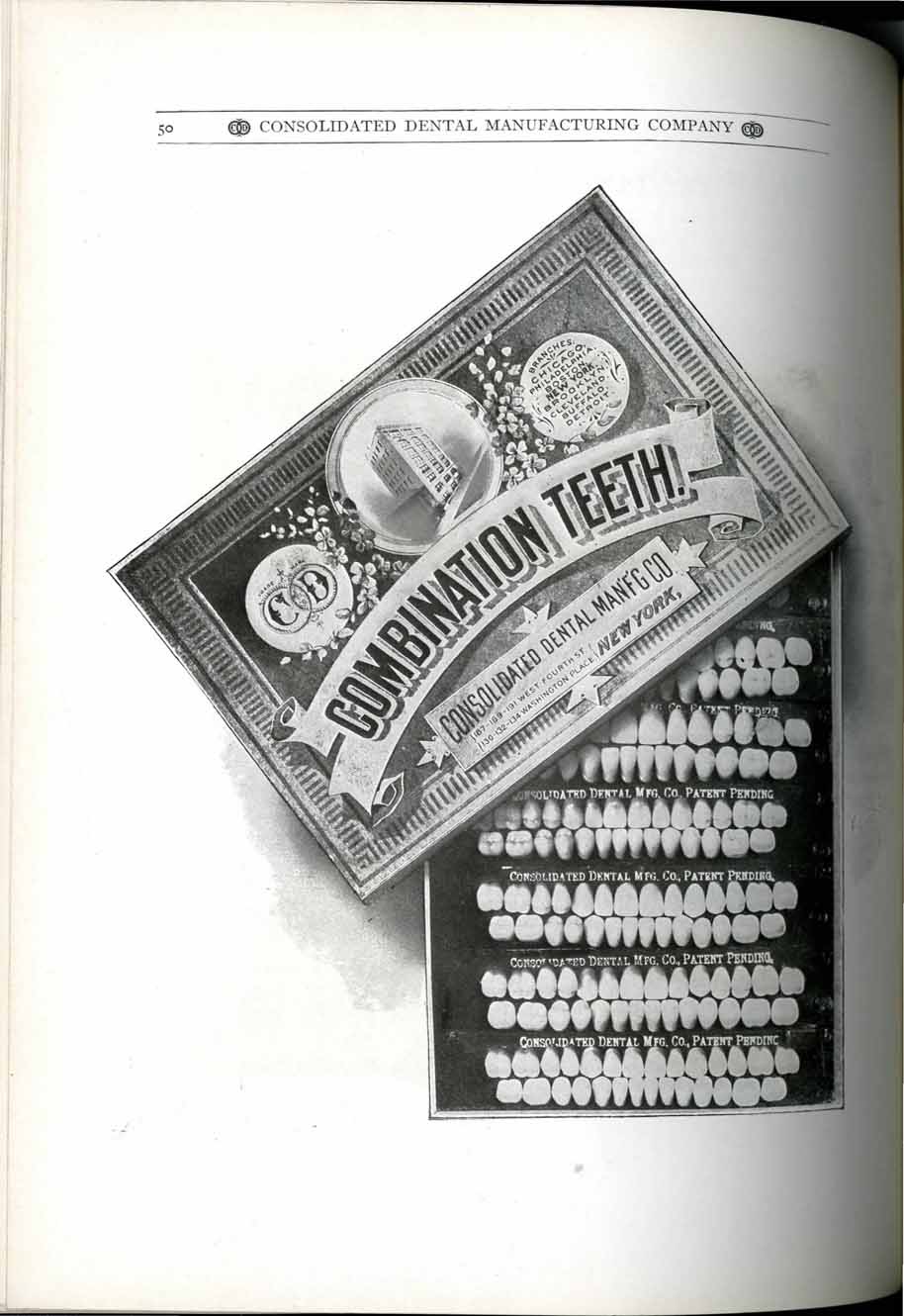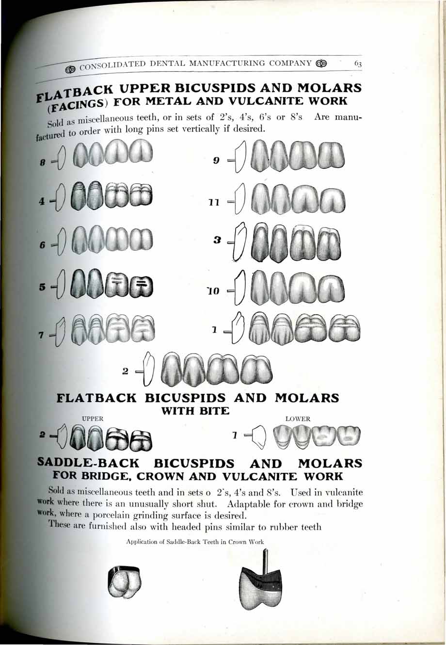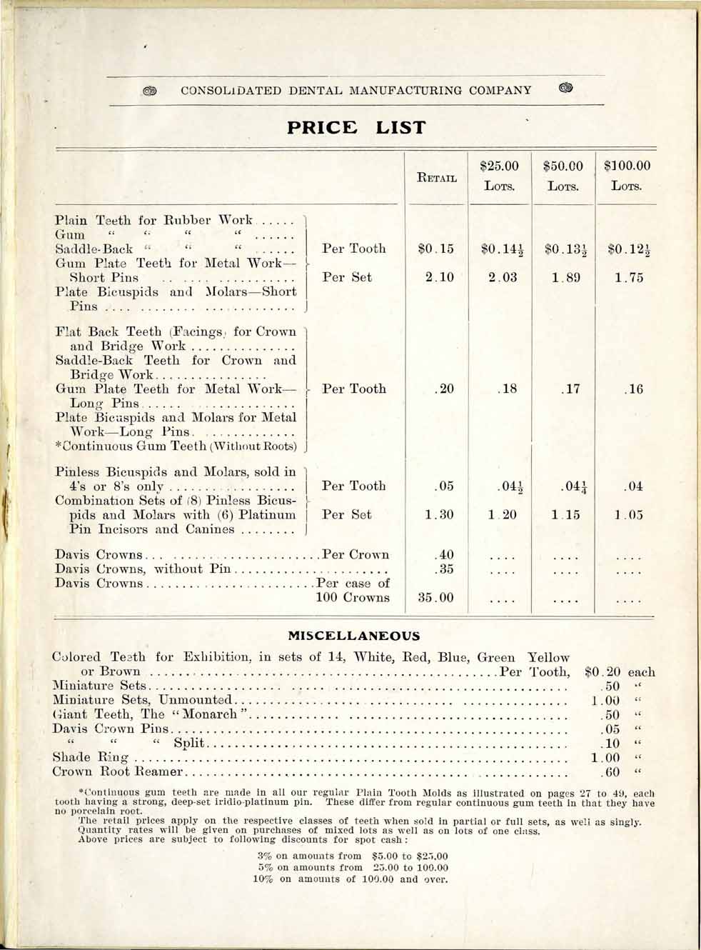 1904 catalogue of artificial teeth and Davis crowns from Consolidated Dental Manufacturing Co., including drawings, detailed descriptions, and price lists.
