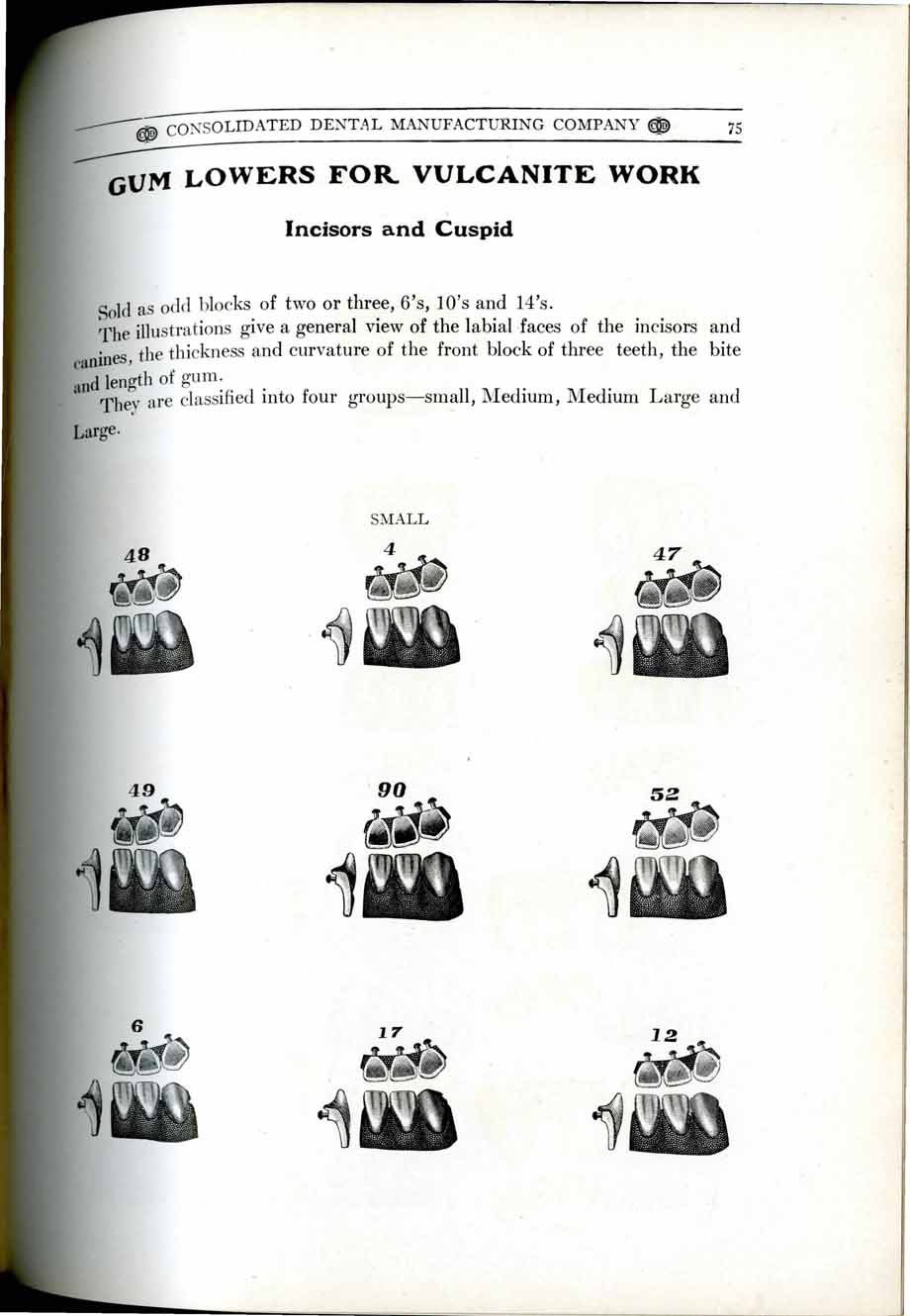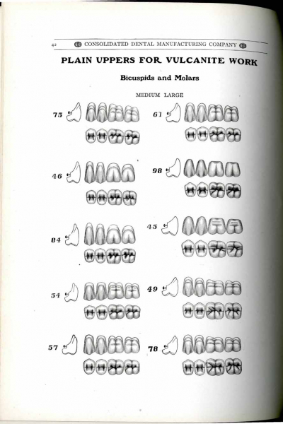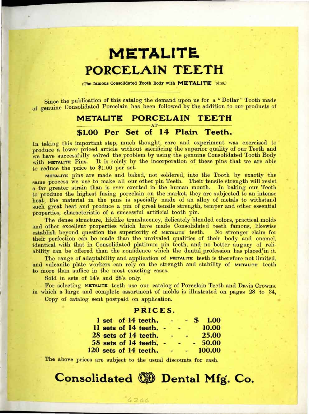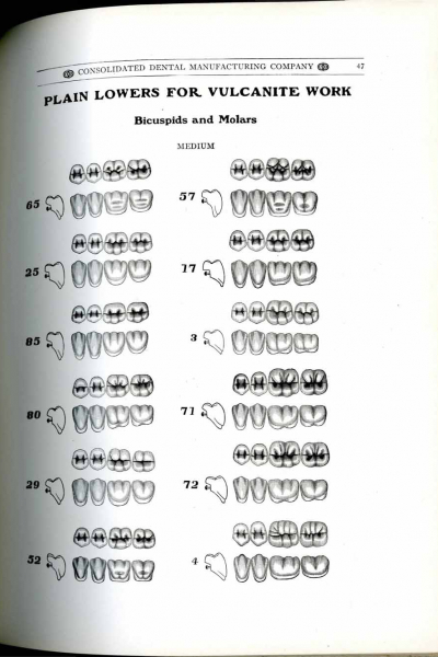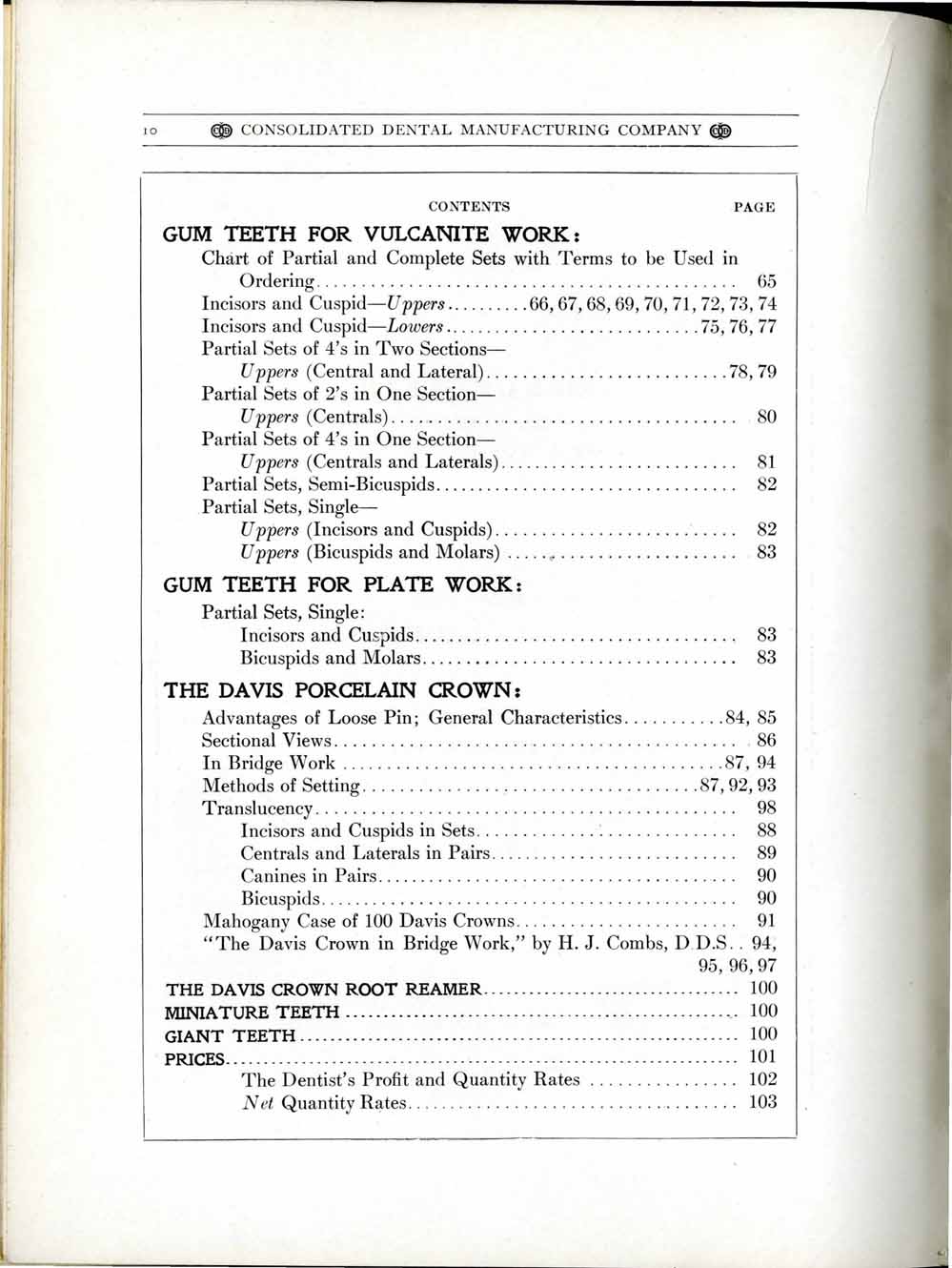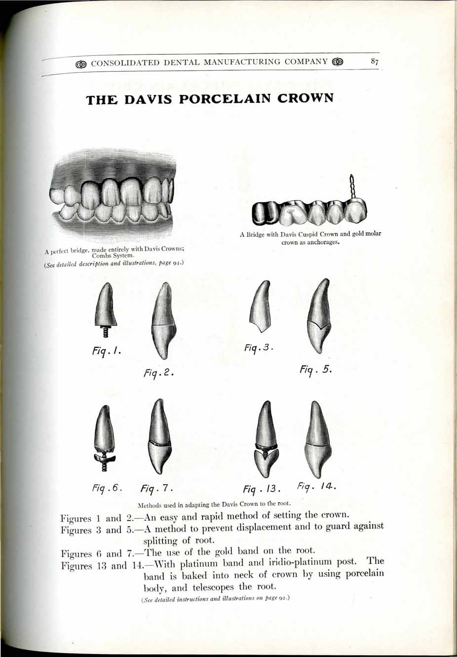 1904 catalogue of artificial teeth and Davis crowns from Consolidated Dental Manufacturing Co., including drawings, detailed descriptions, and price lists.