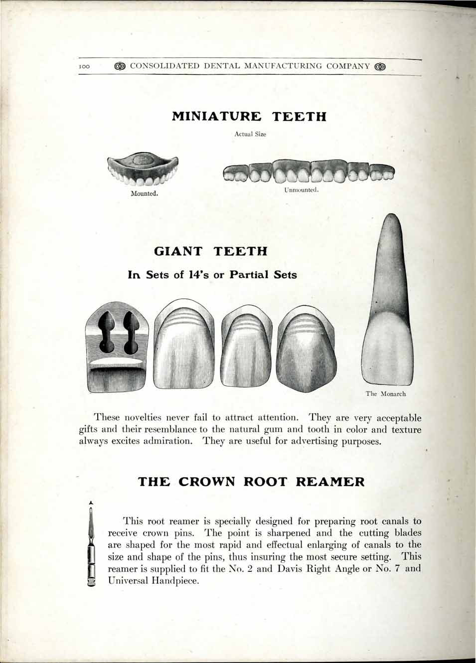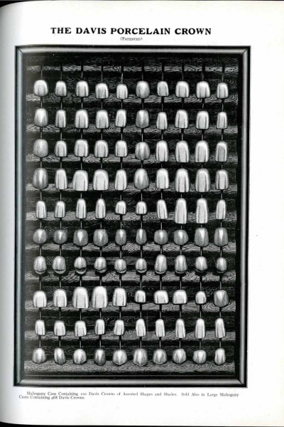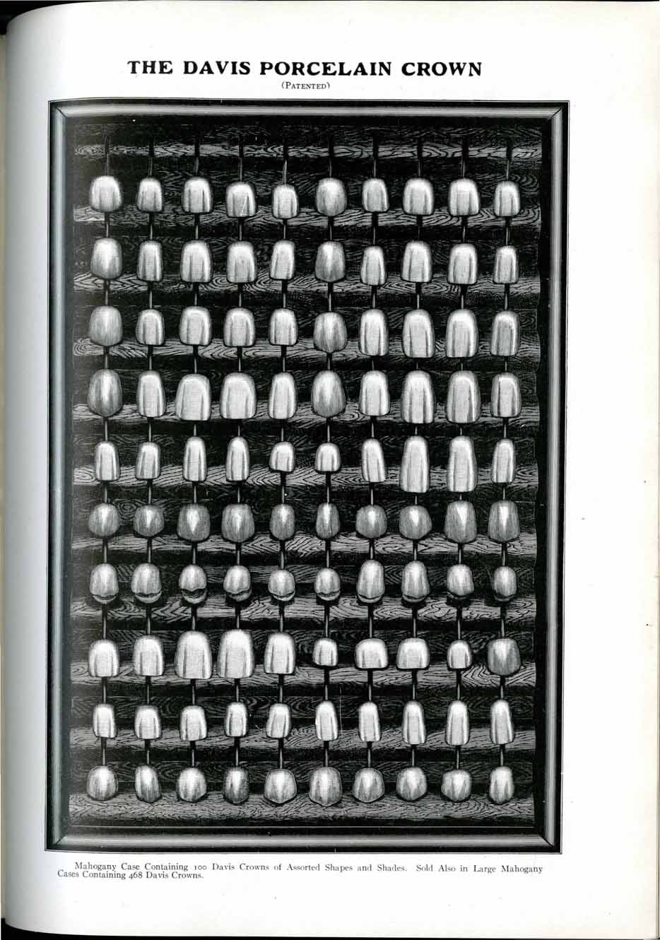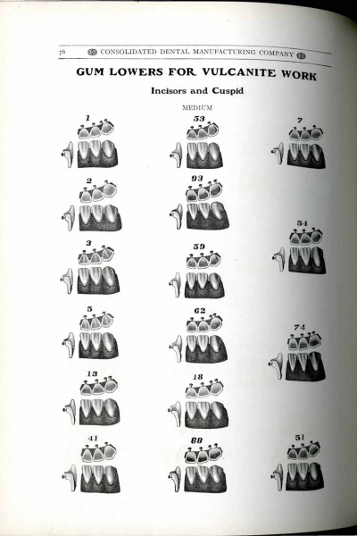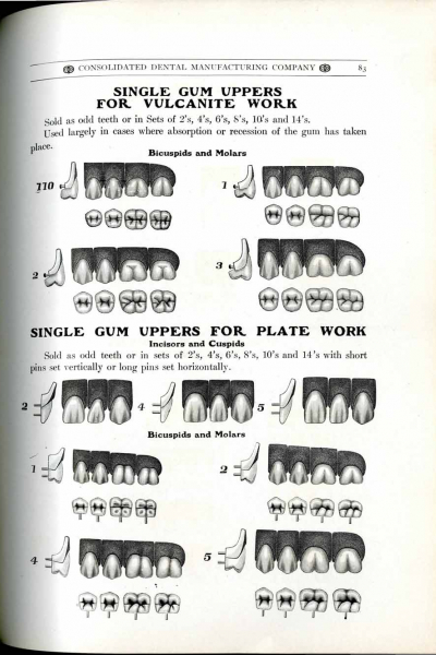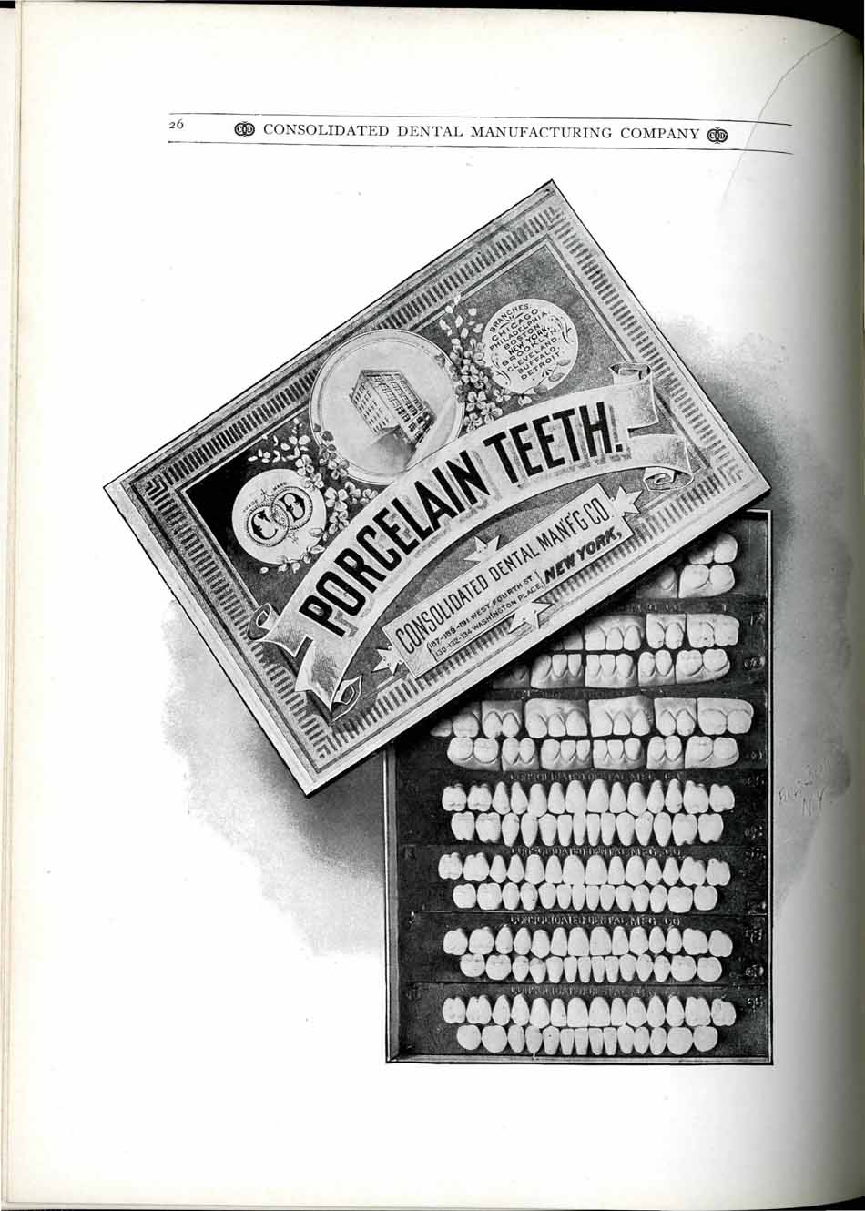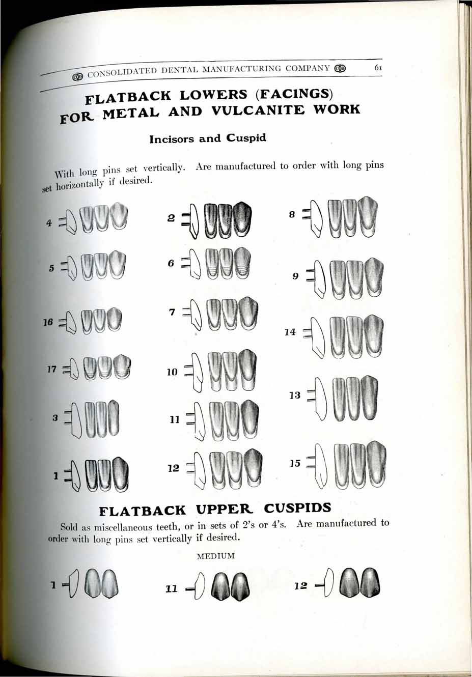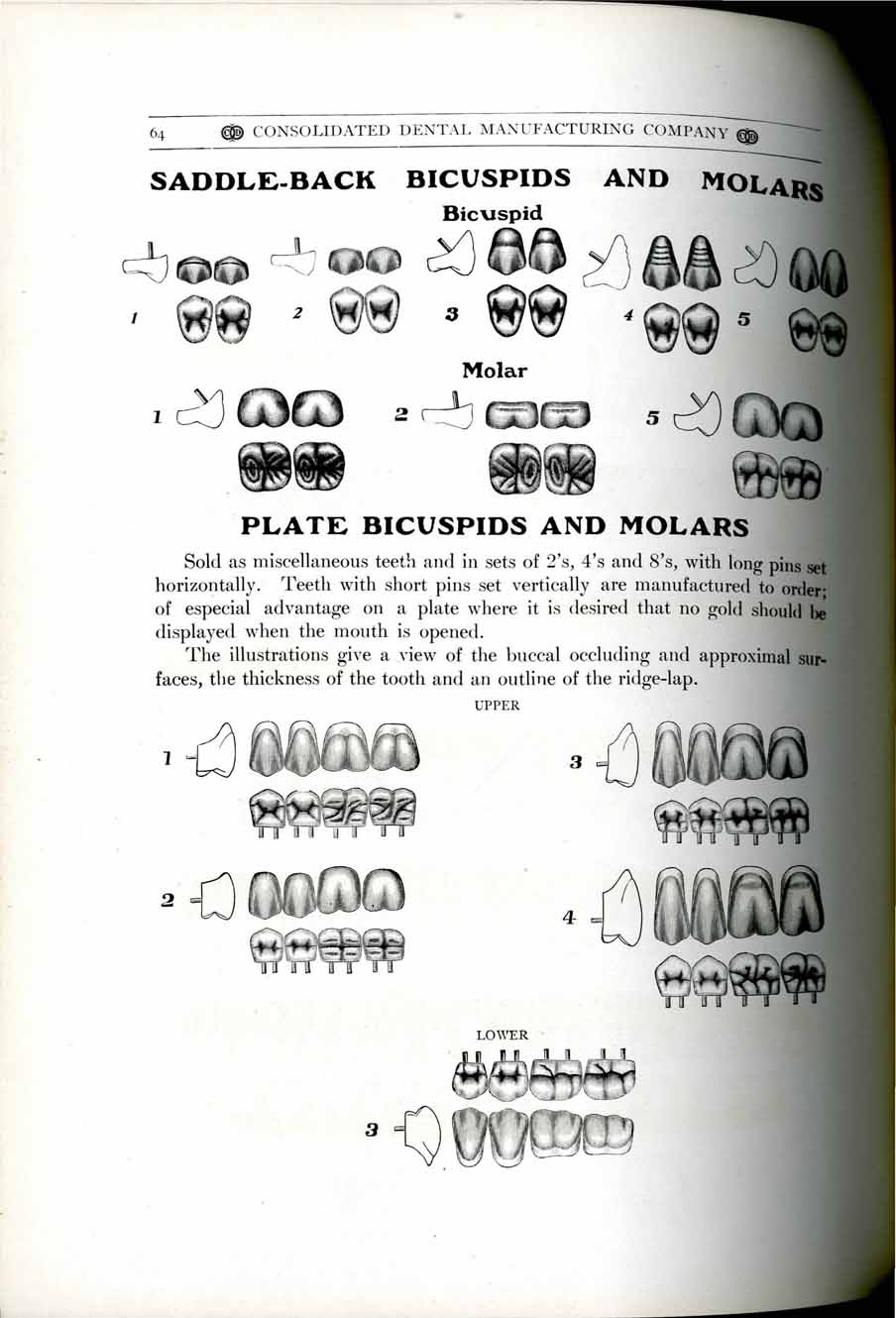 1904 catalogue of artificial teeth and Davis crowns from Consolidated Dental Manufacturing Co., including drawings, detailed descriptions, and price lists.