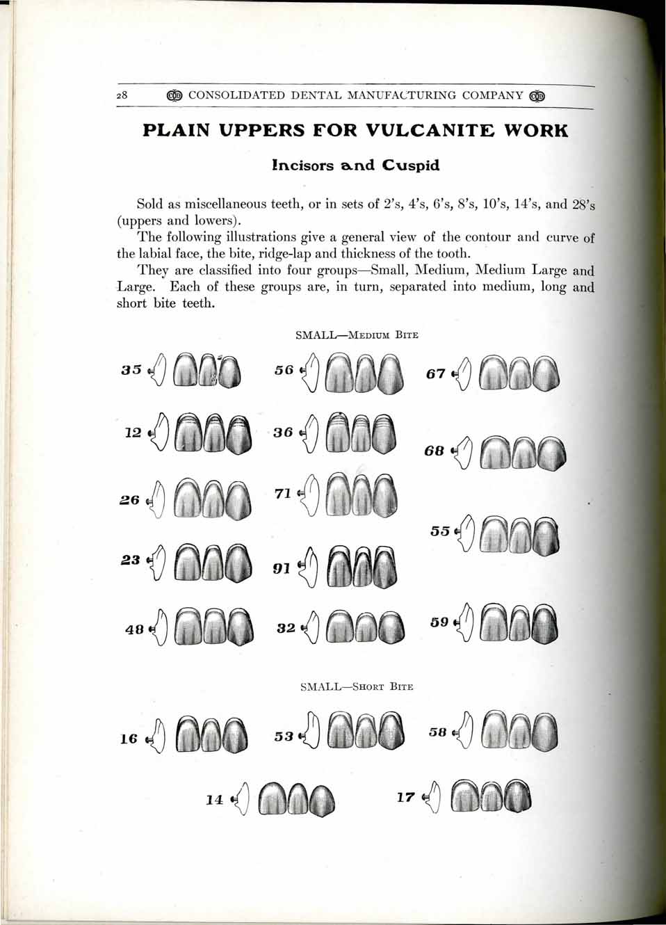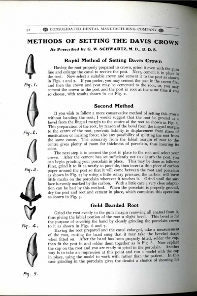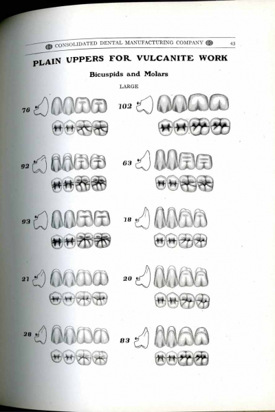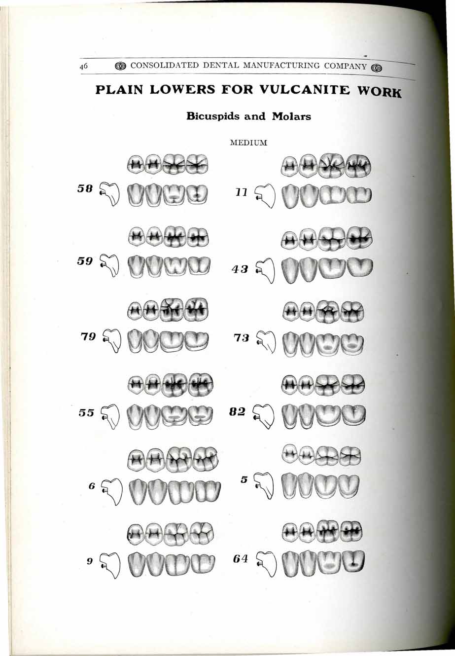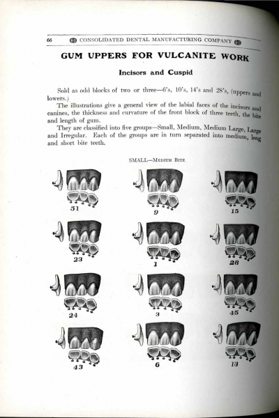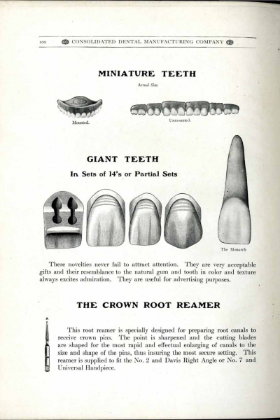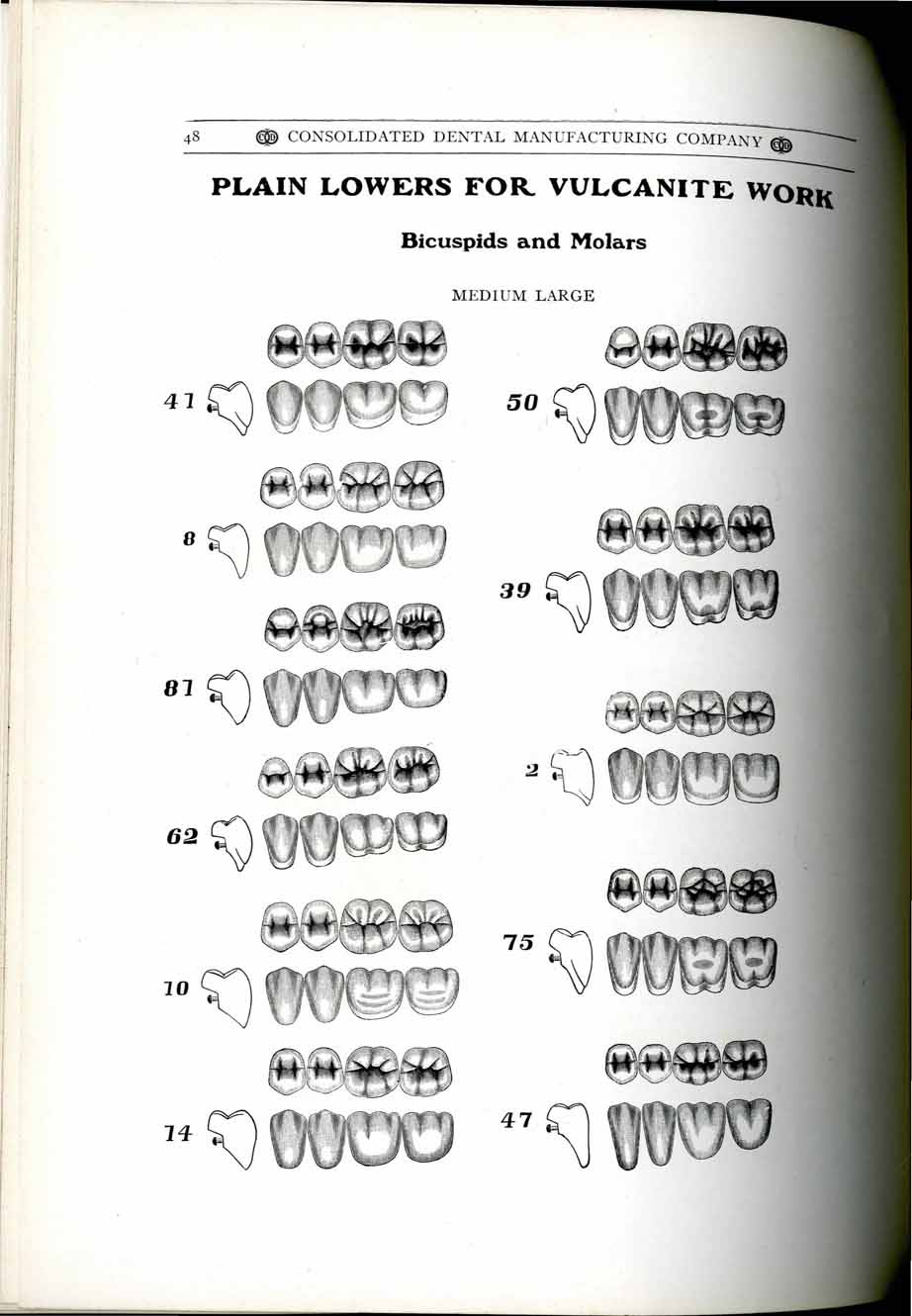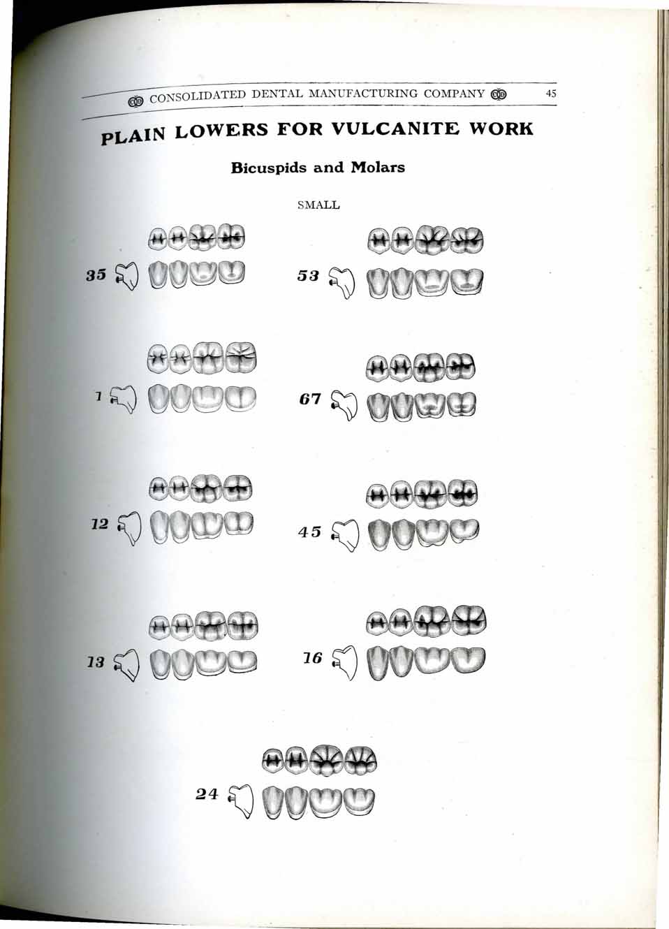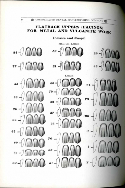 1904 catalogue of artificial teeth and Davis crowns from Consolidated Dental Manufacturing Co., including drawings, detailed descriptions, and price lists.