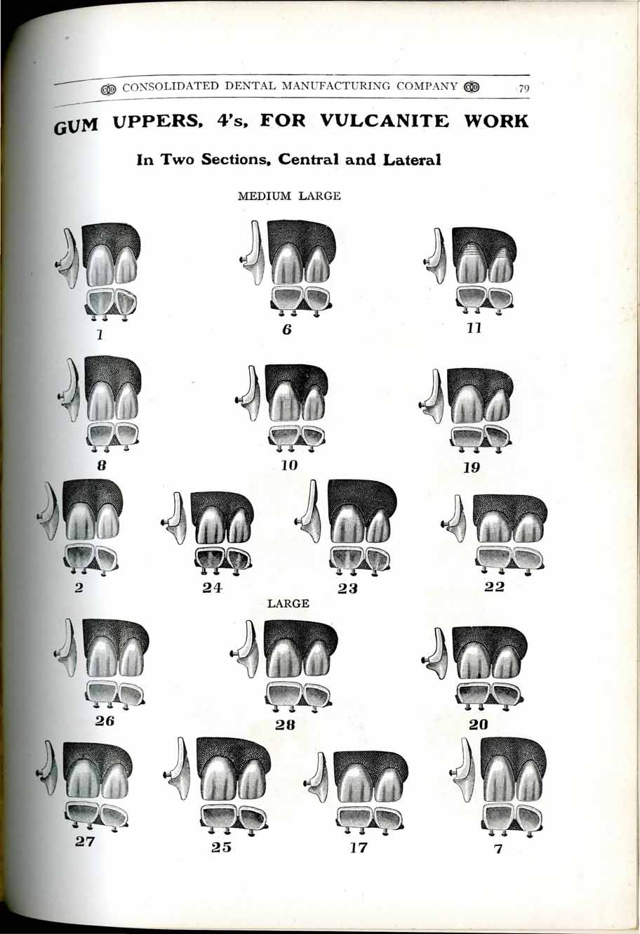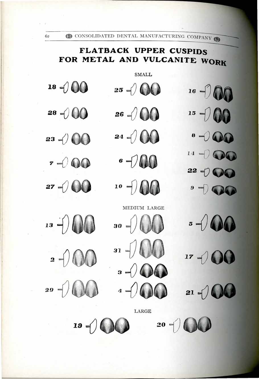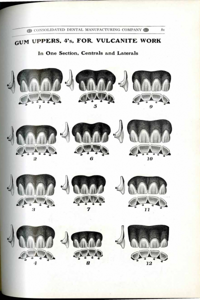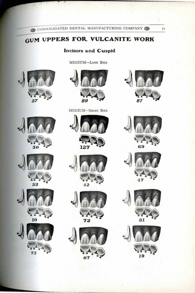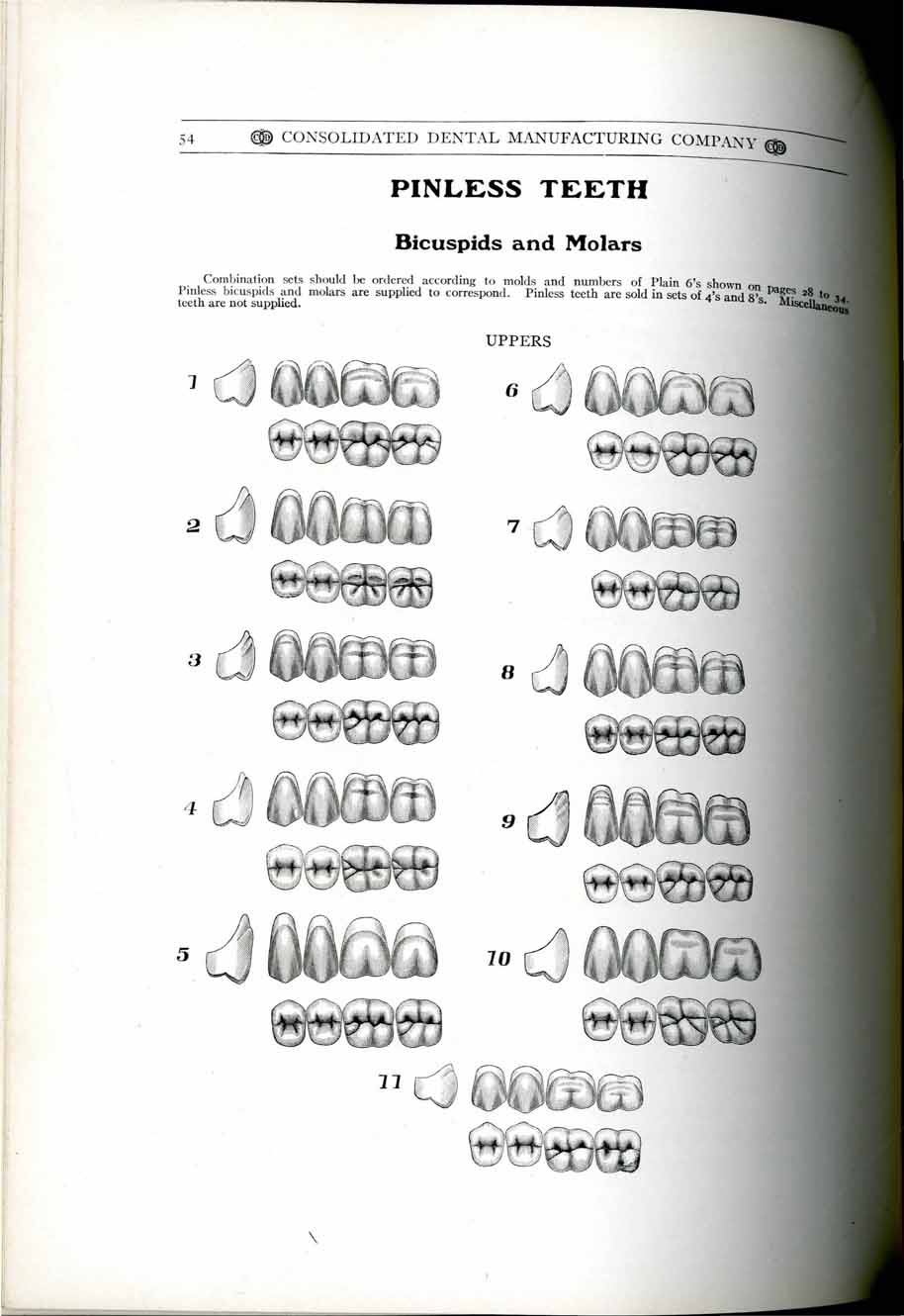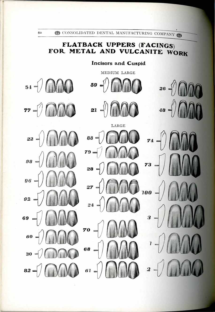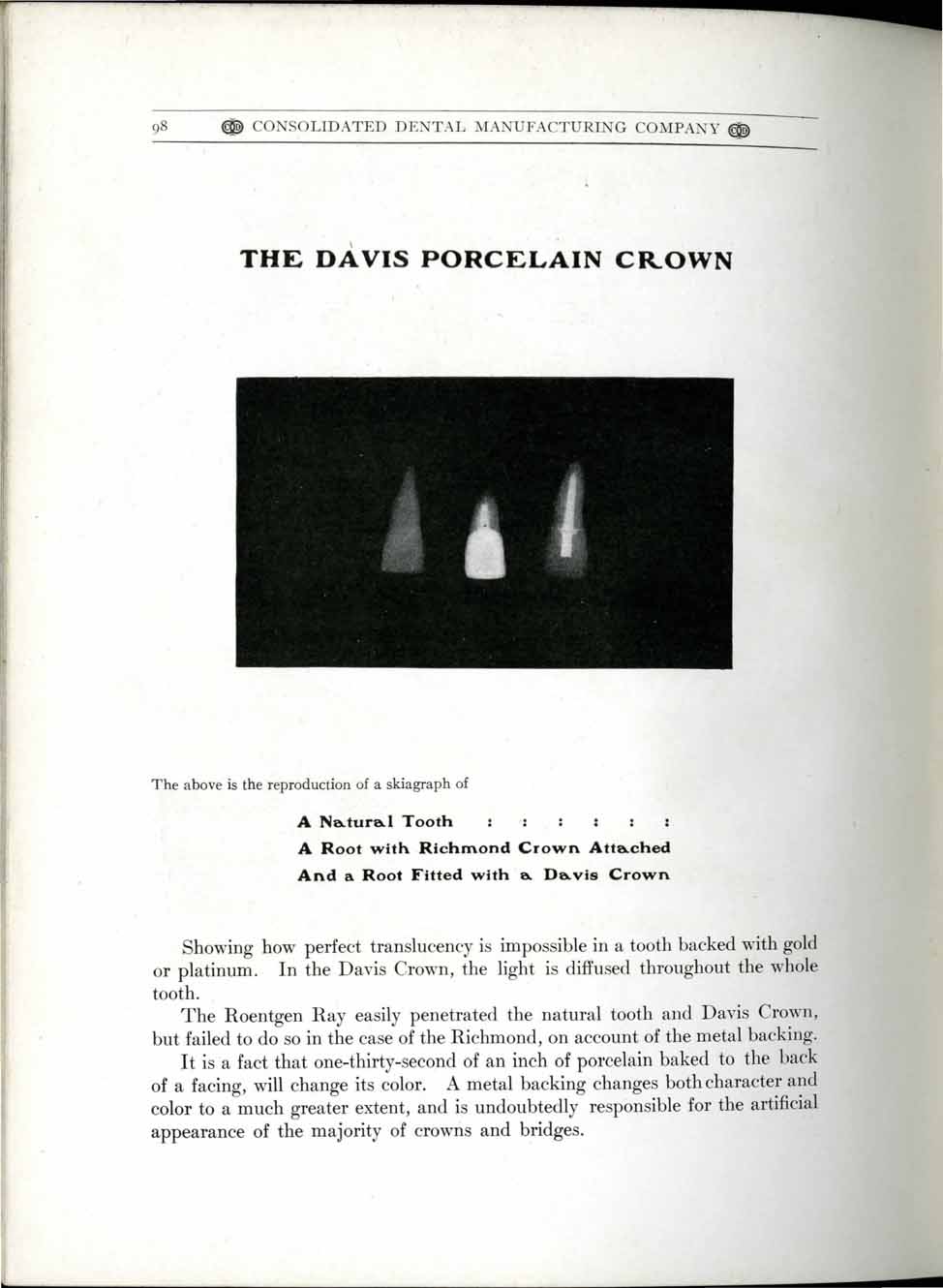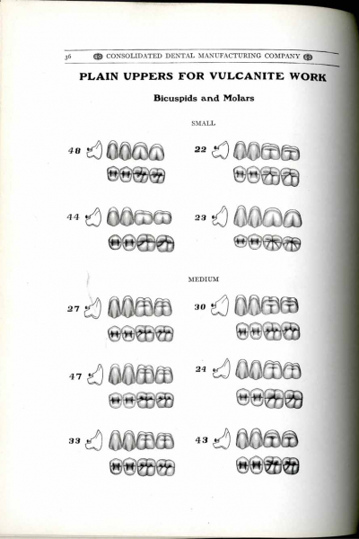 1904 catalogue of artificial teeth and Davis crowns from Consolidated Dental Manufacturing Co., including drawings, detailed descriptions, and price lists.