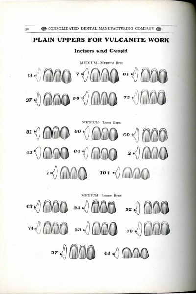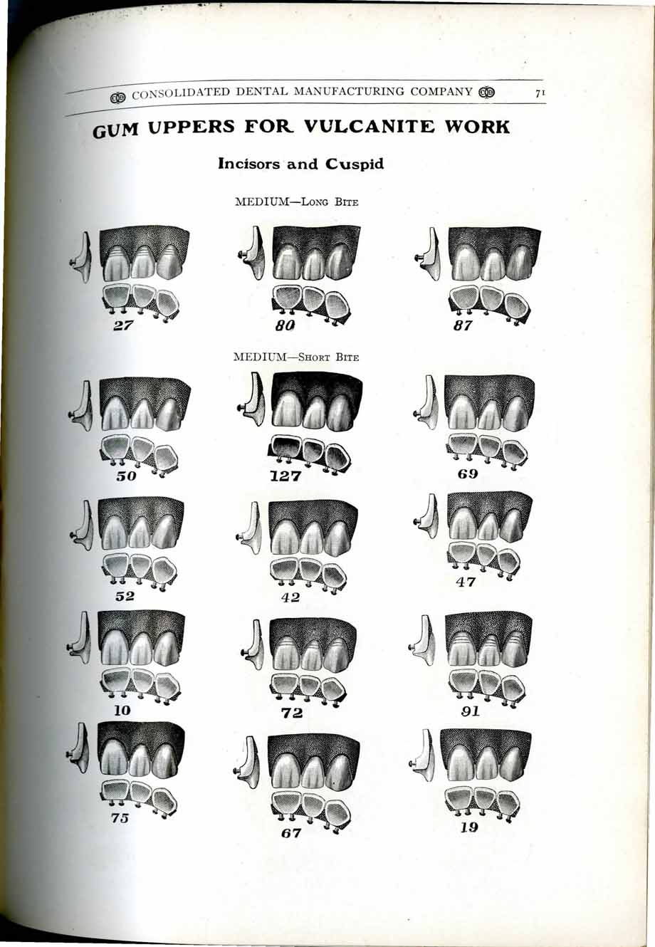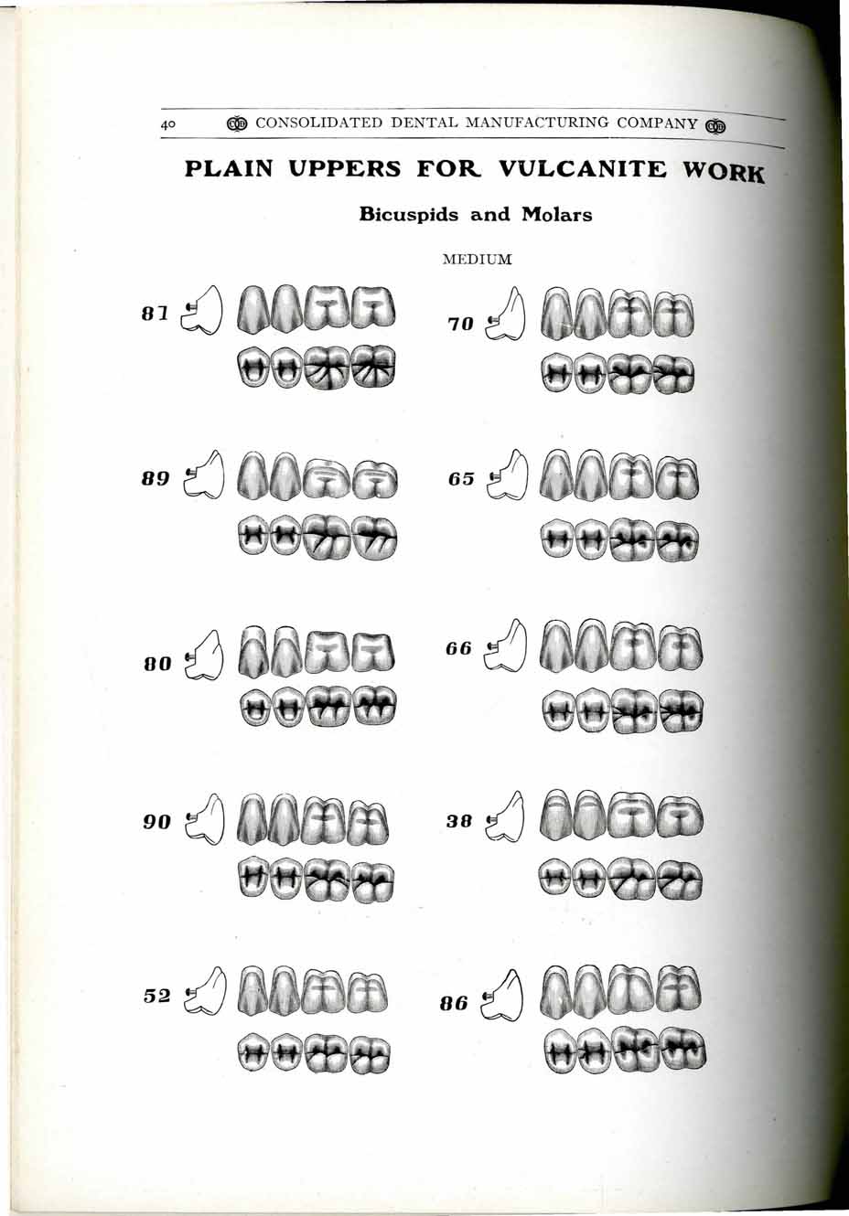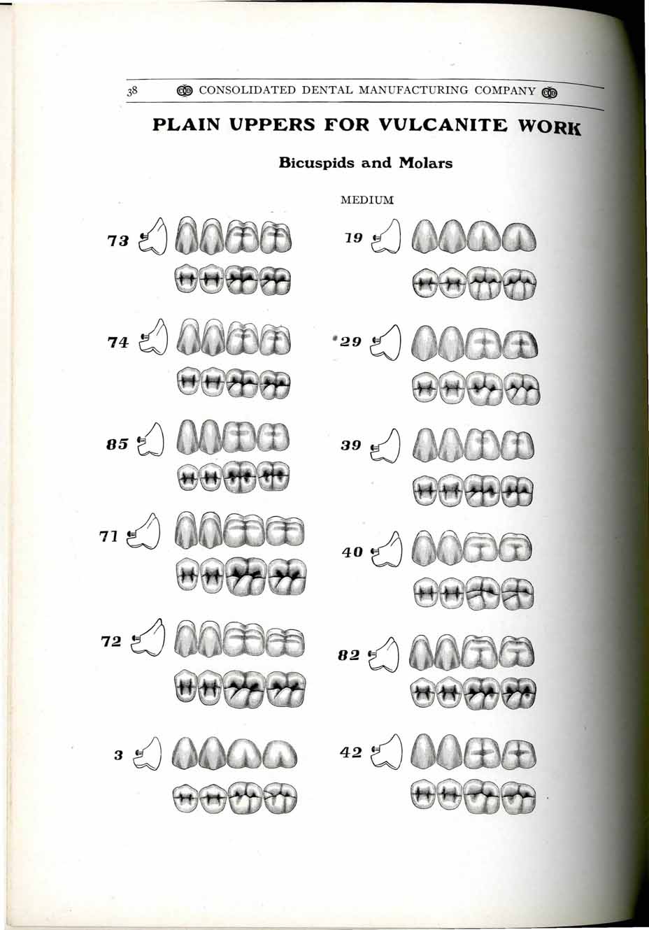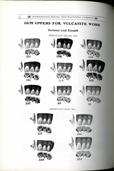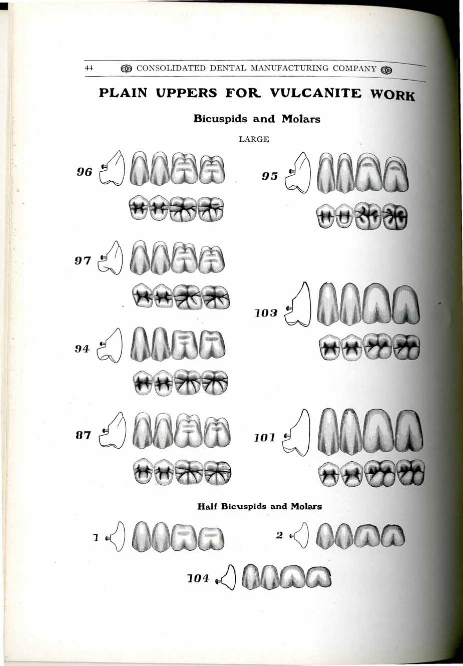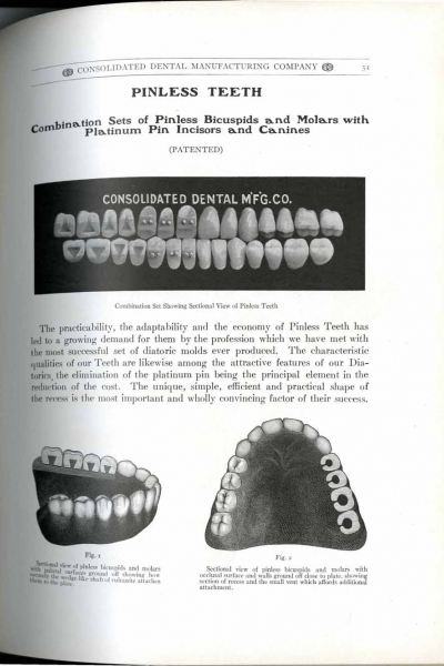 1904 catalogue of artificial teeth and Davis crowns from Consolidated Dental Manufacturing Co., including drawings, detailed descriptions, and price lists.