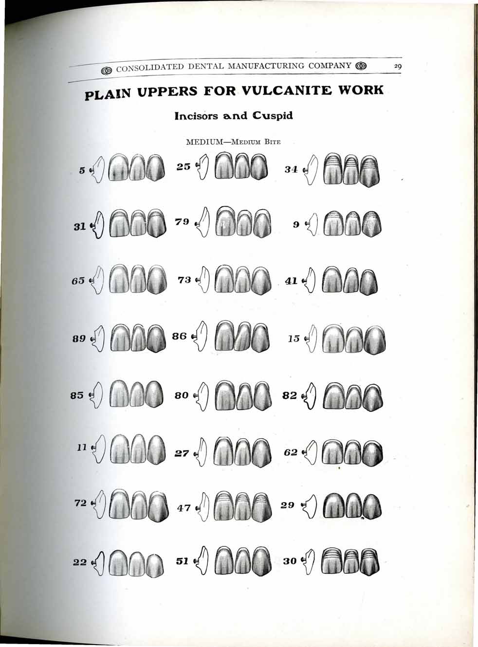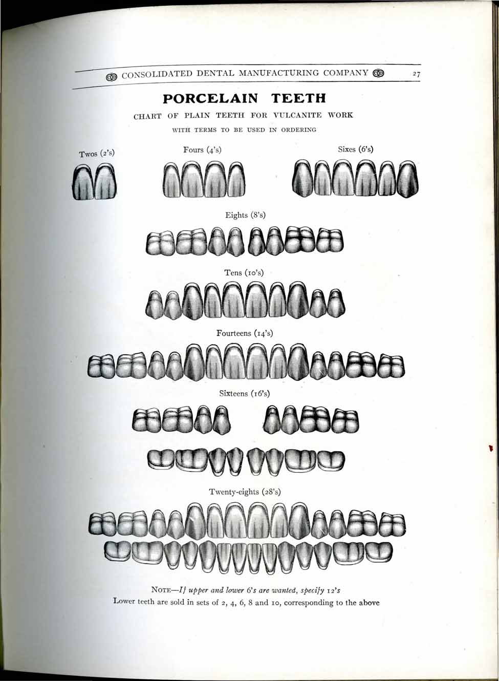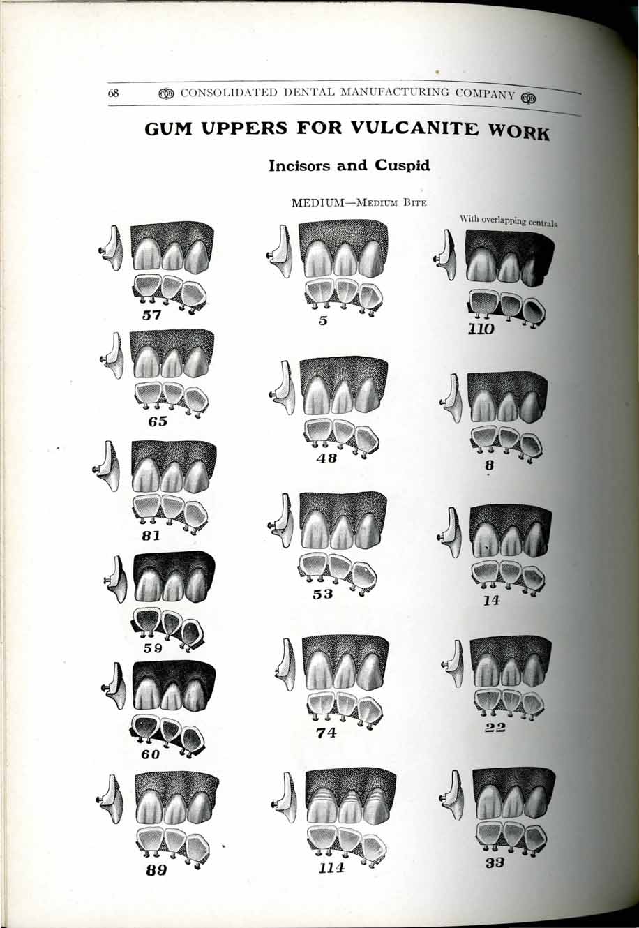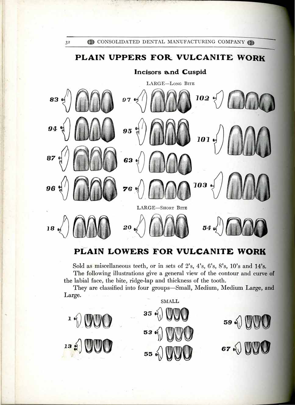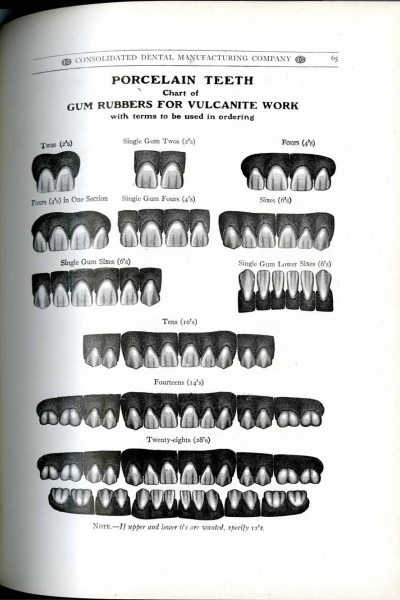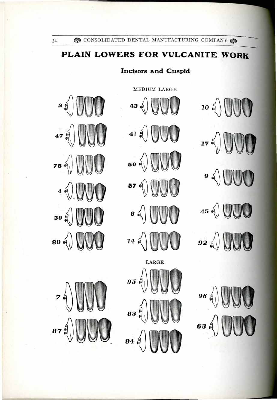 1904 catalogue of artificial teeth and Davis crowns from Consolidated Dental Manufacturing Co., including drawings, detailed descriptions, and price lists.