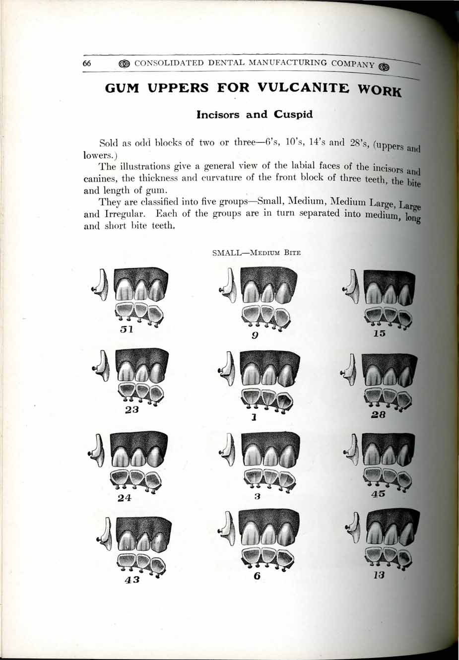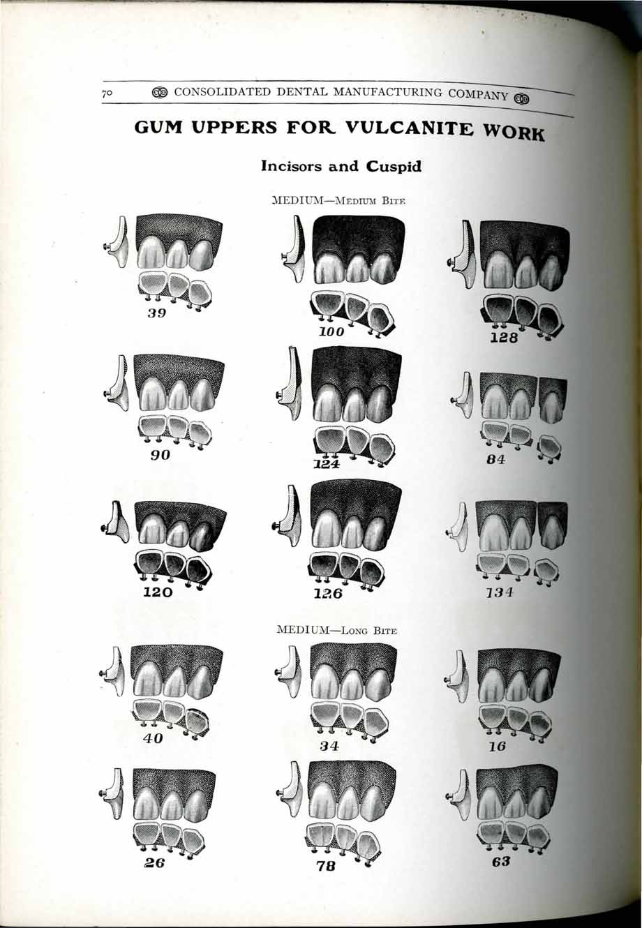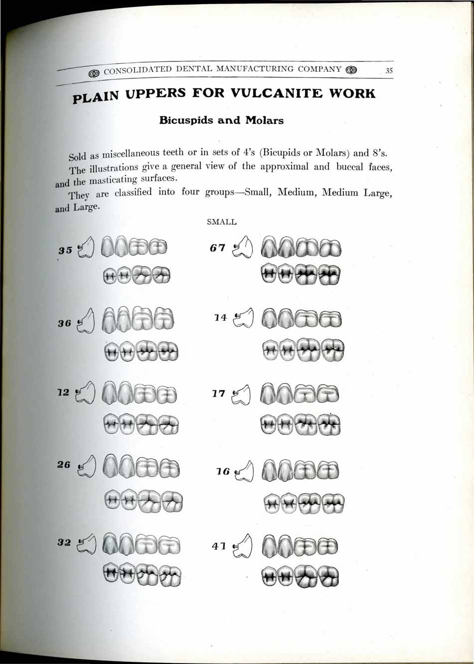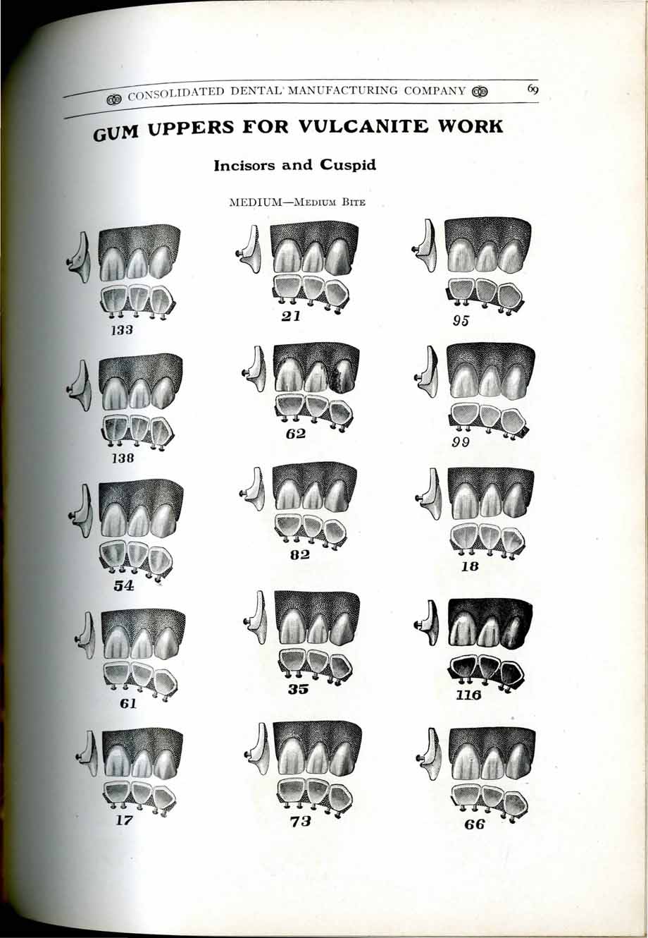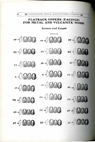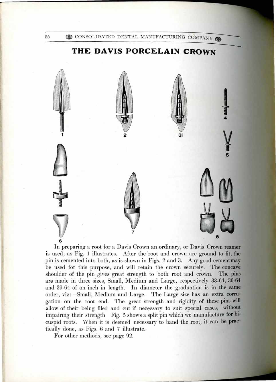 1904 catalogue of artificial teeth and Davis crowns from Consolidated Dental Manufacturing Co., including drawings, detailed descriptions, and price lists.