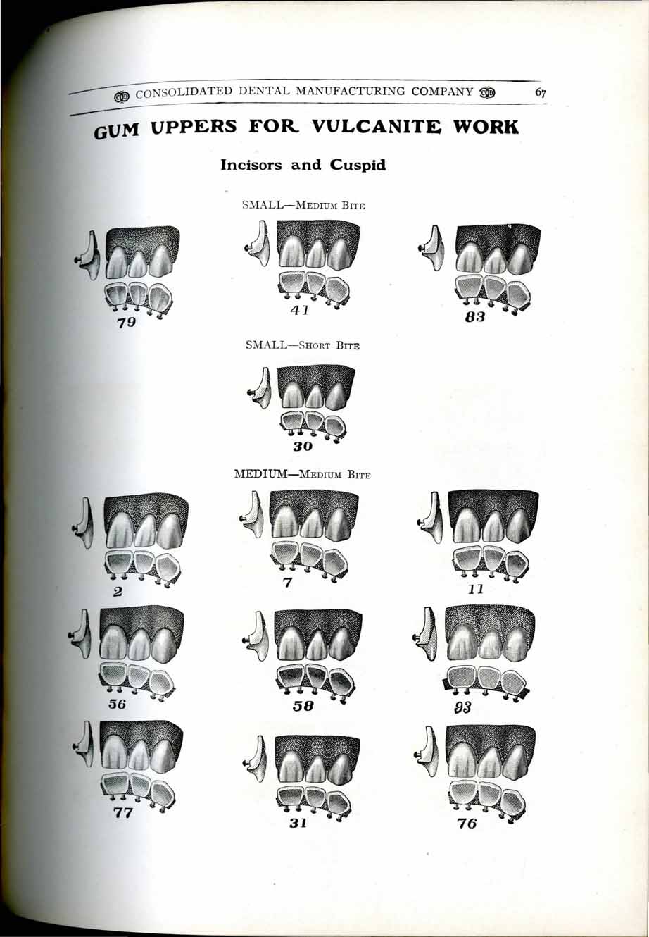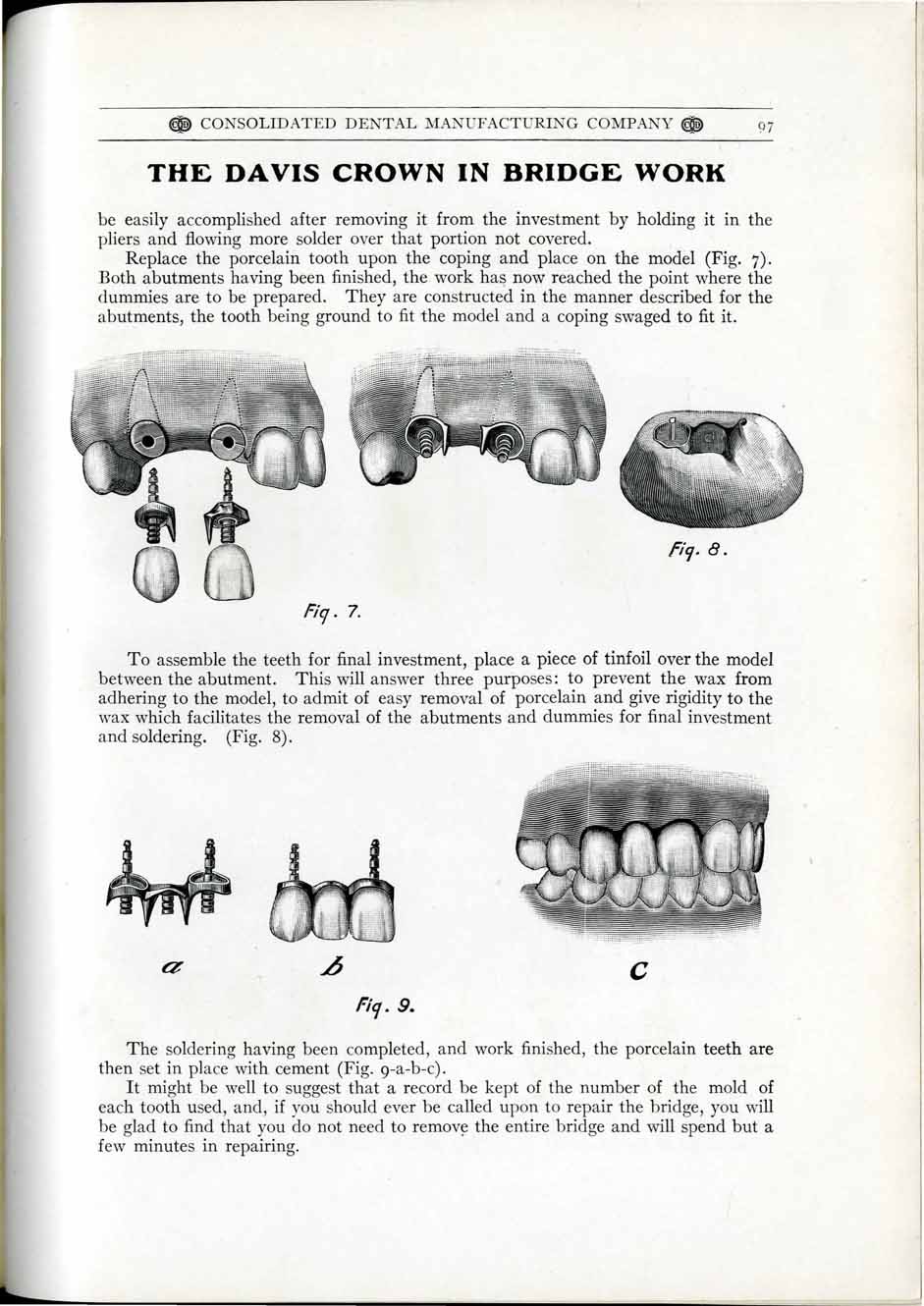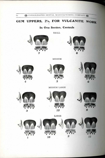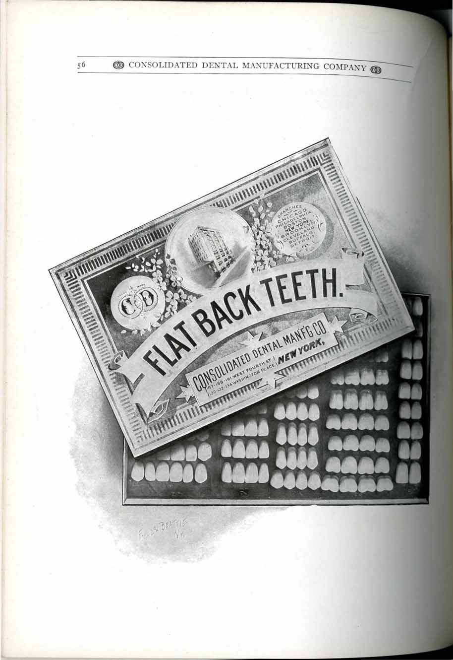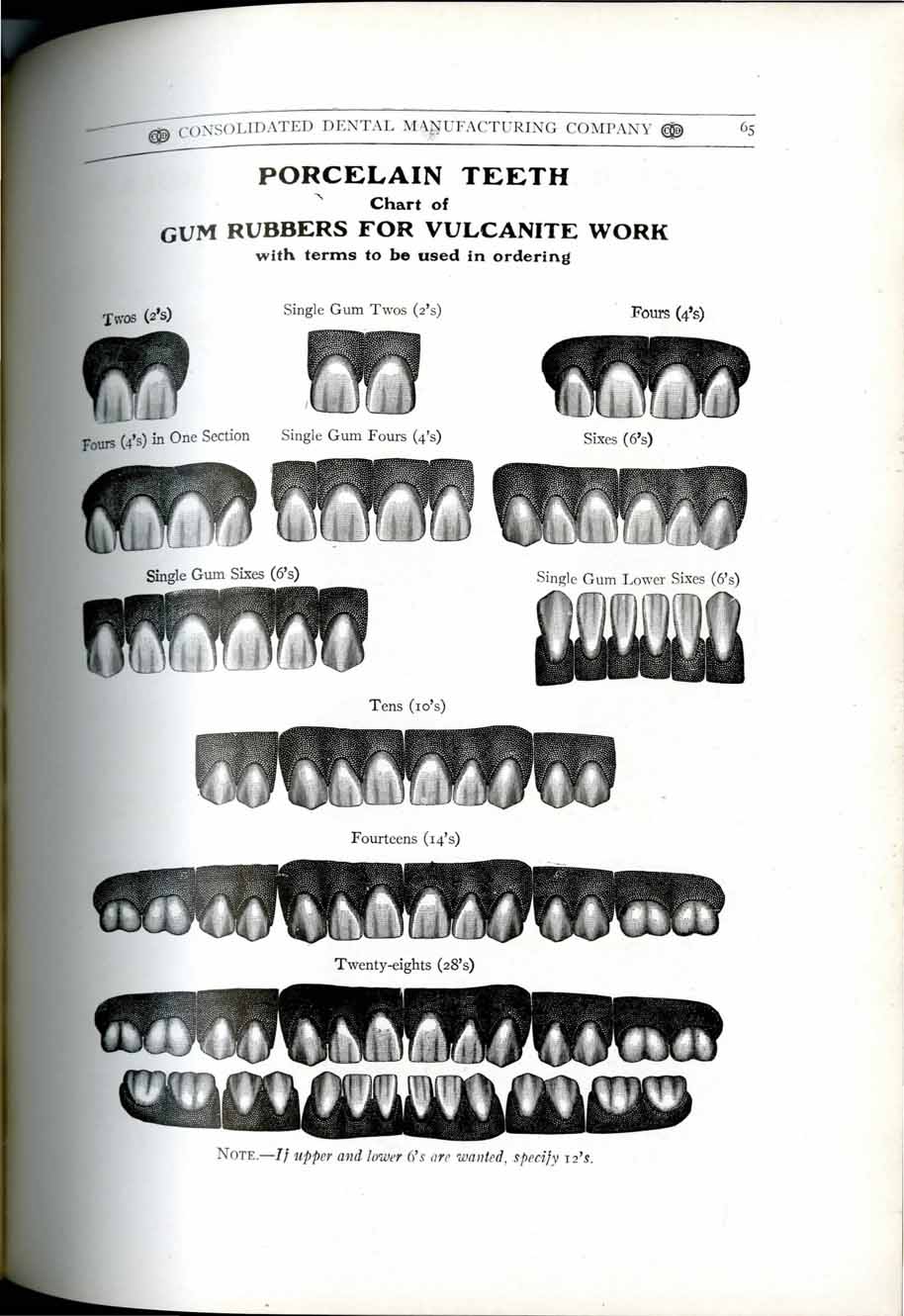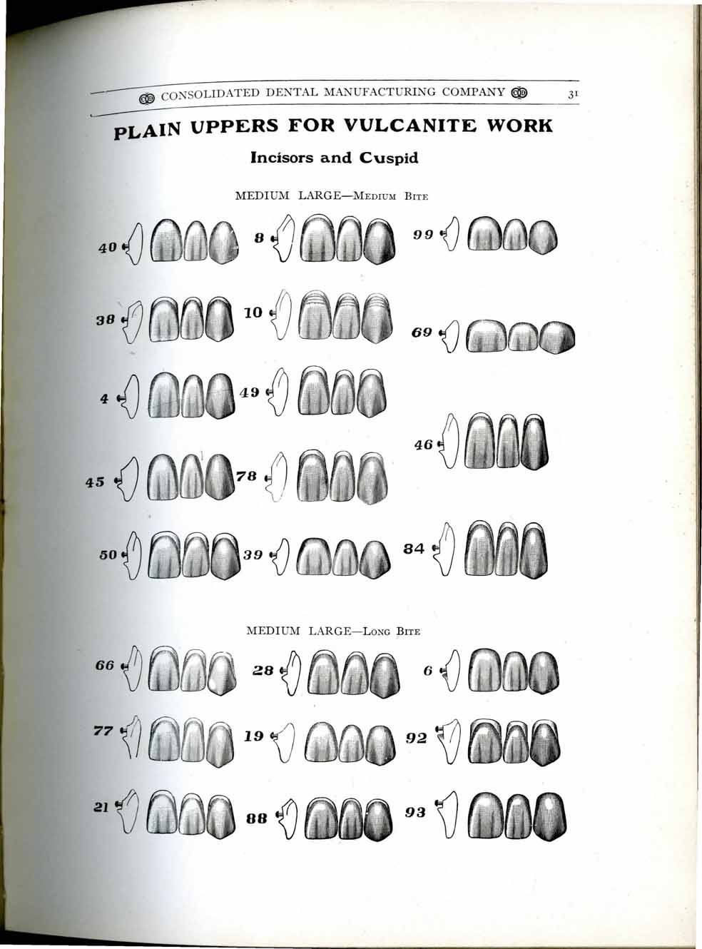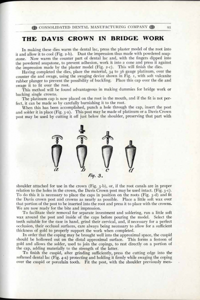 1904 catalogue of artificial teeth and Davis crowns from Consolidated Dental Manufacturing Co., including drawings, detailed descriptions, and price lists.