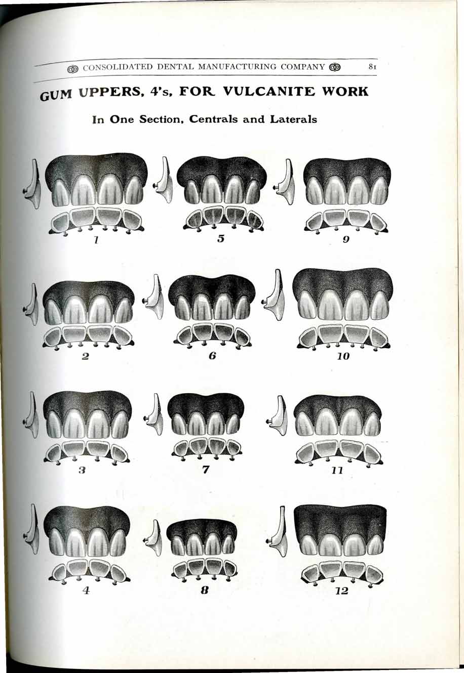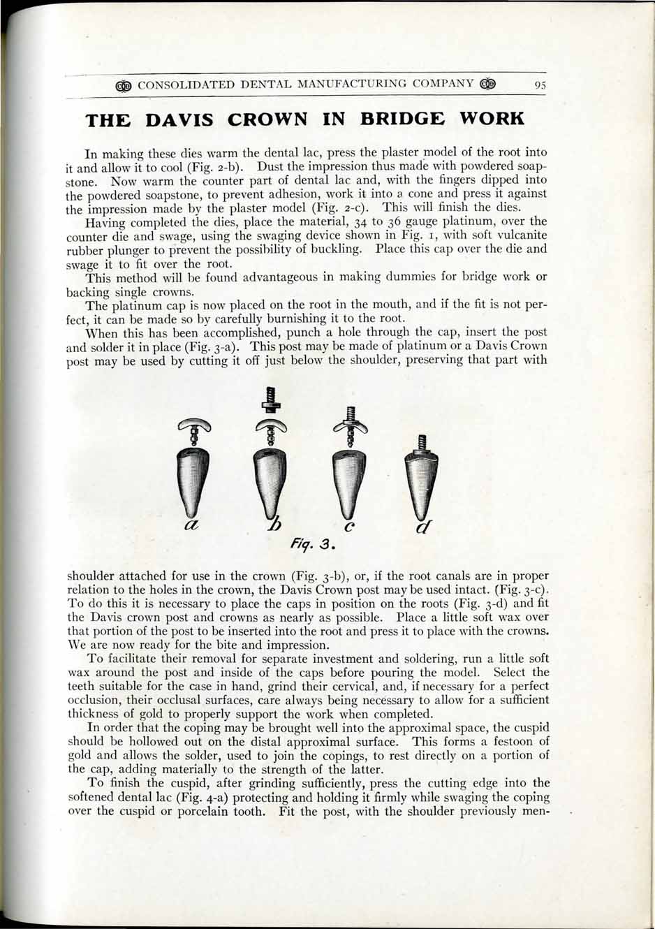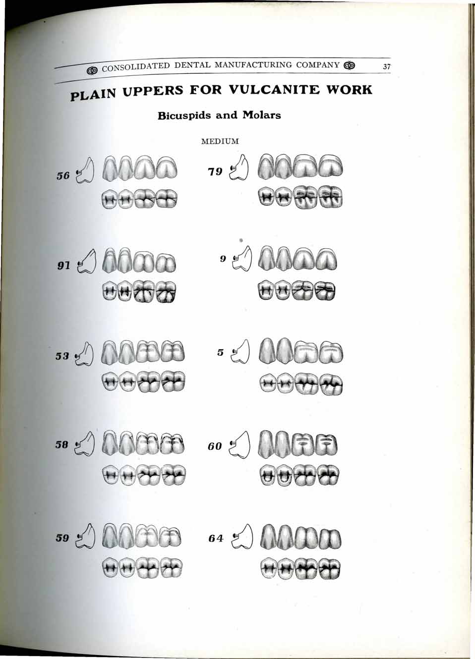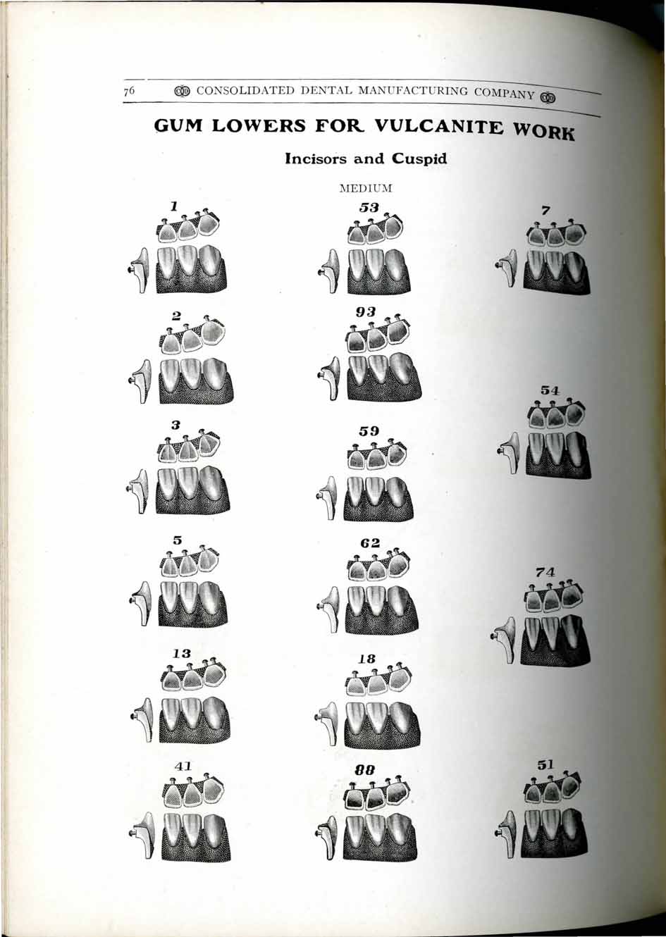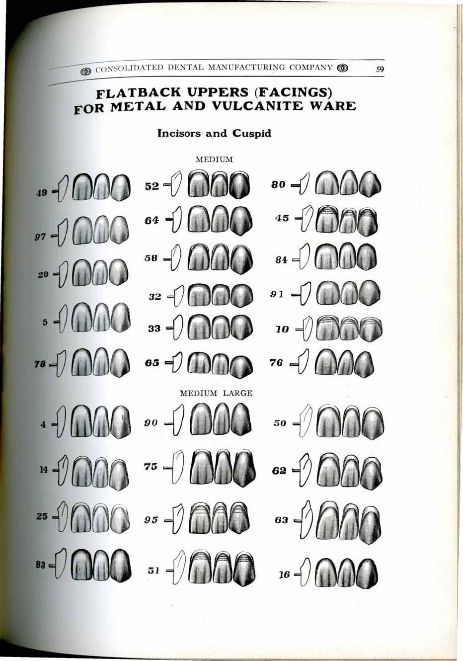 1904 catalogue of artificial teeth and Davis crowns from Consolidated Dental Manufacturing Co., including drawings, detailed descriptions, and price lists.