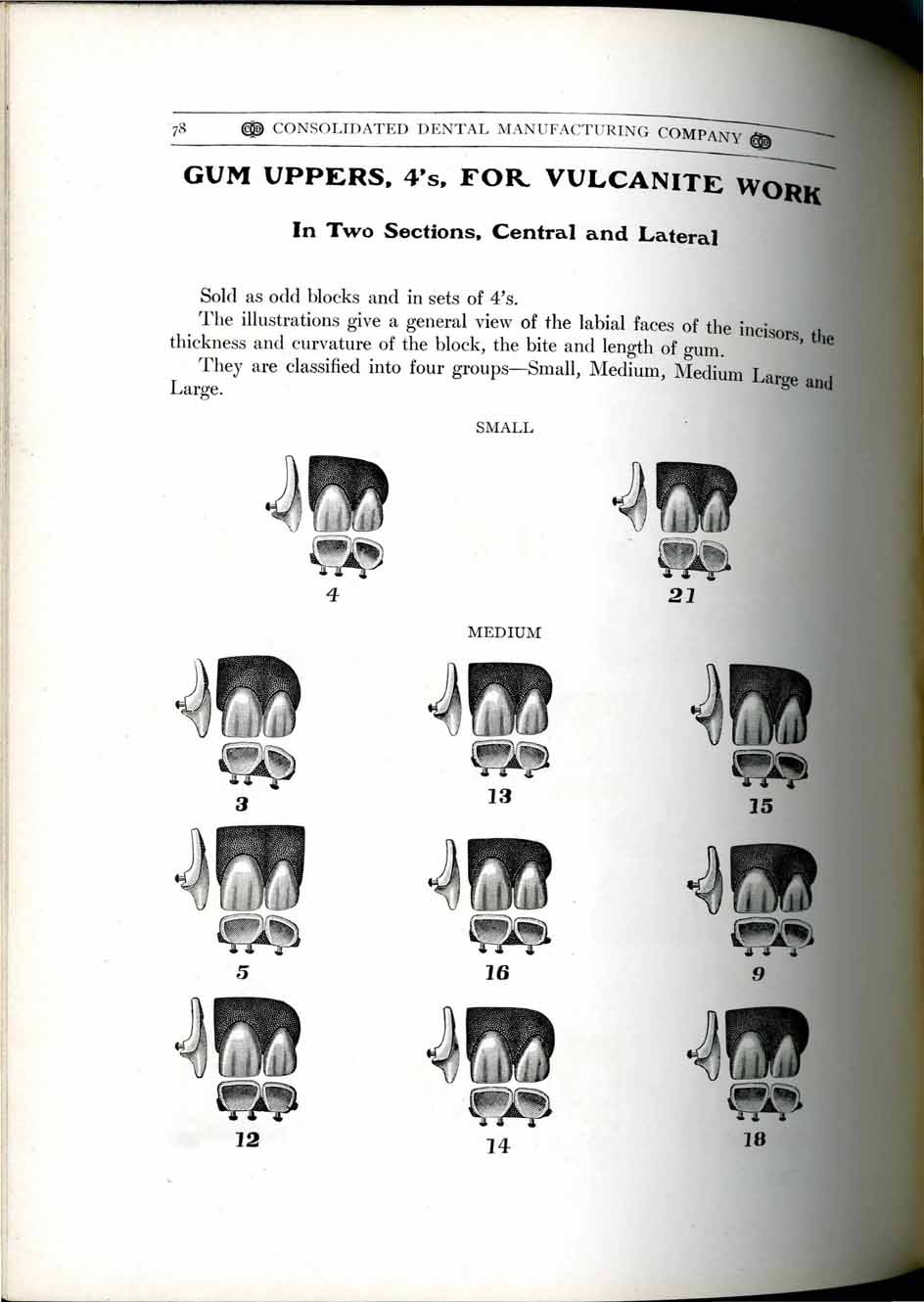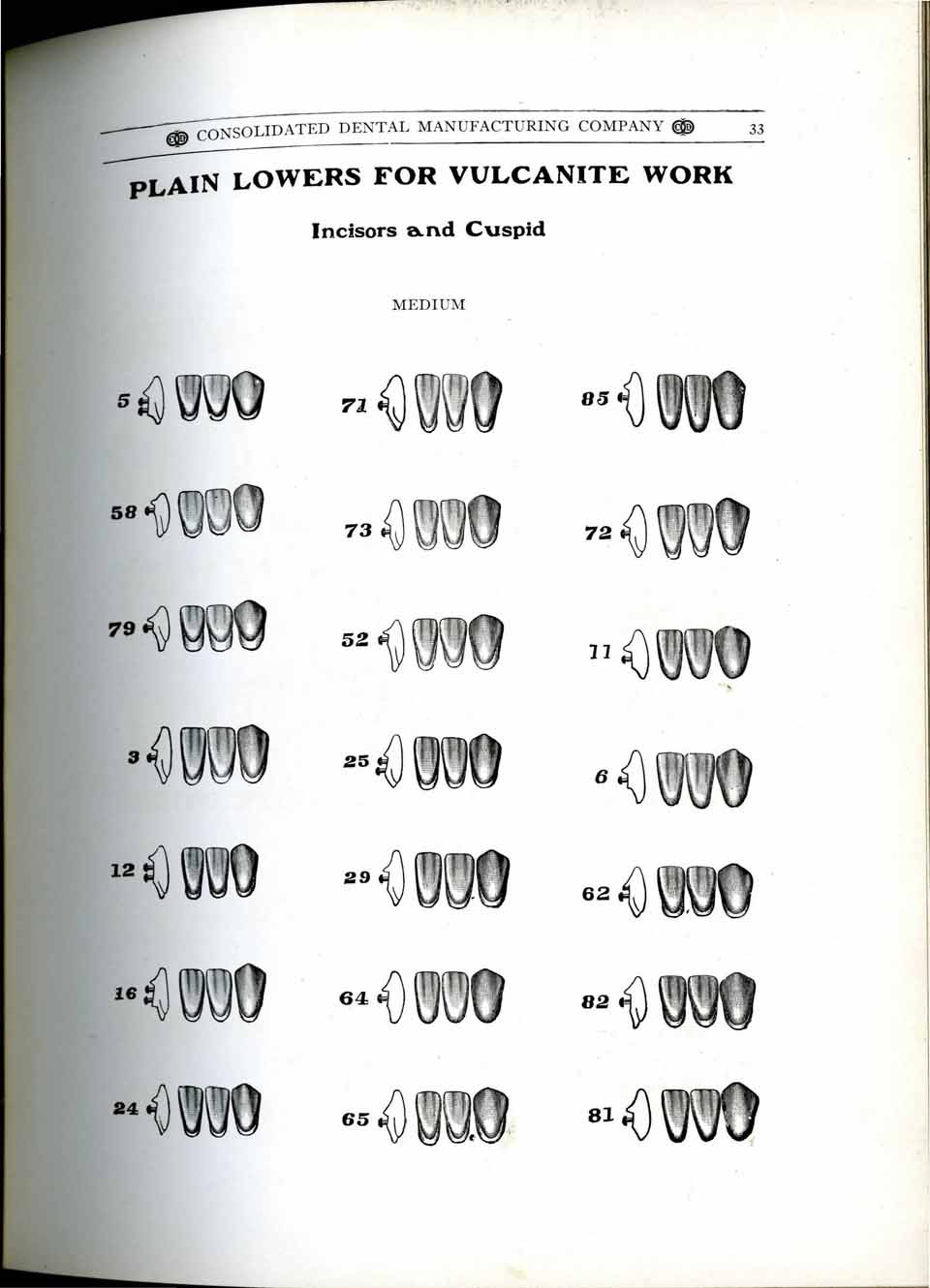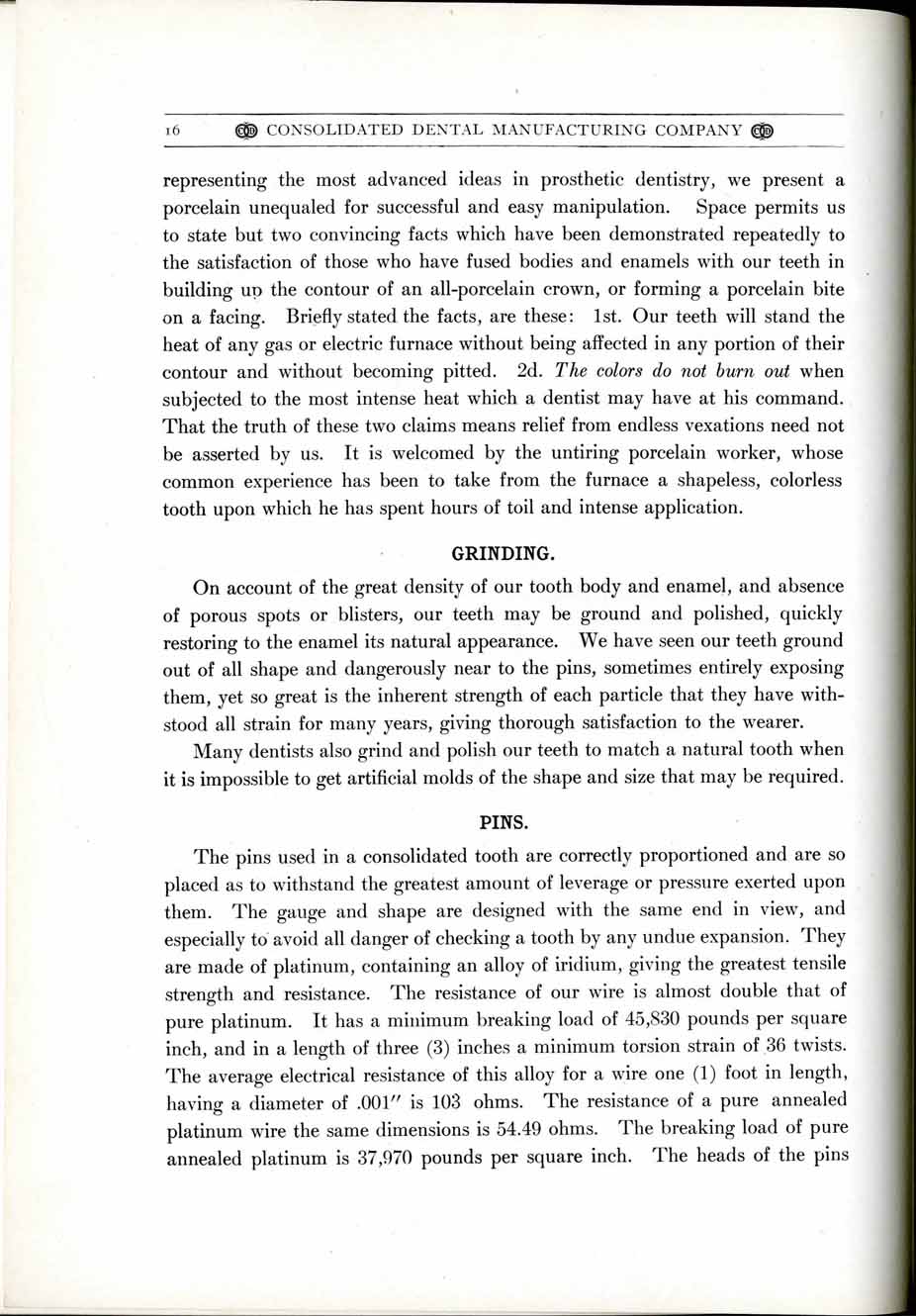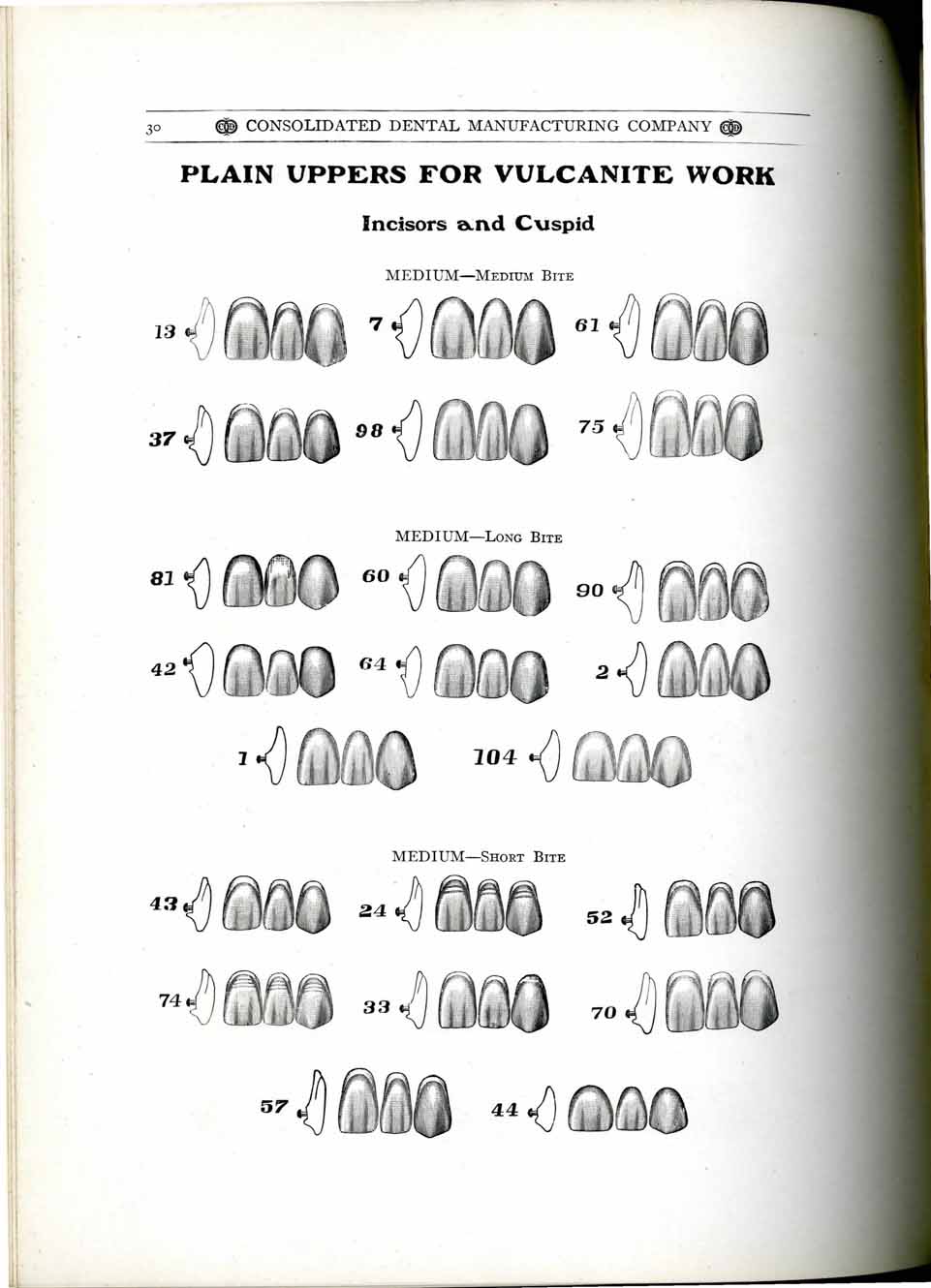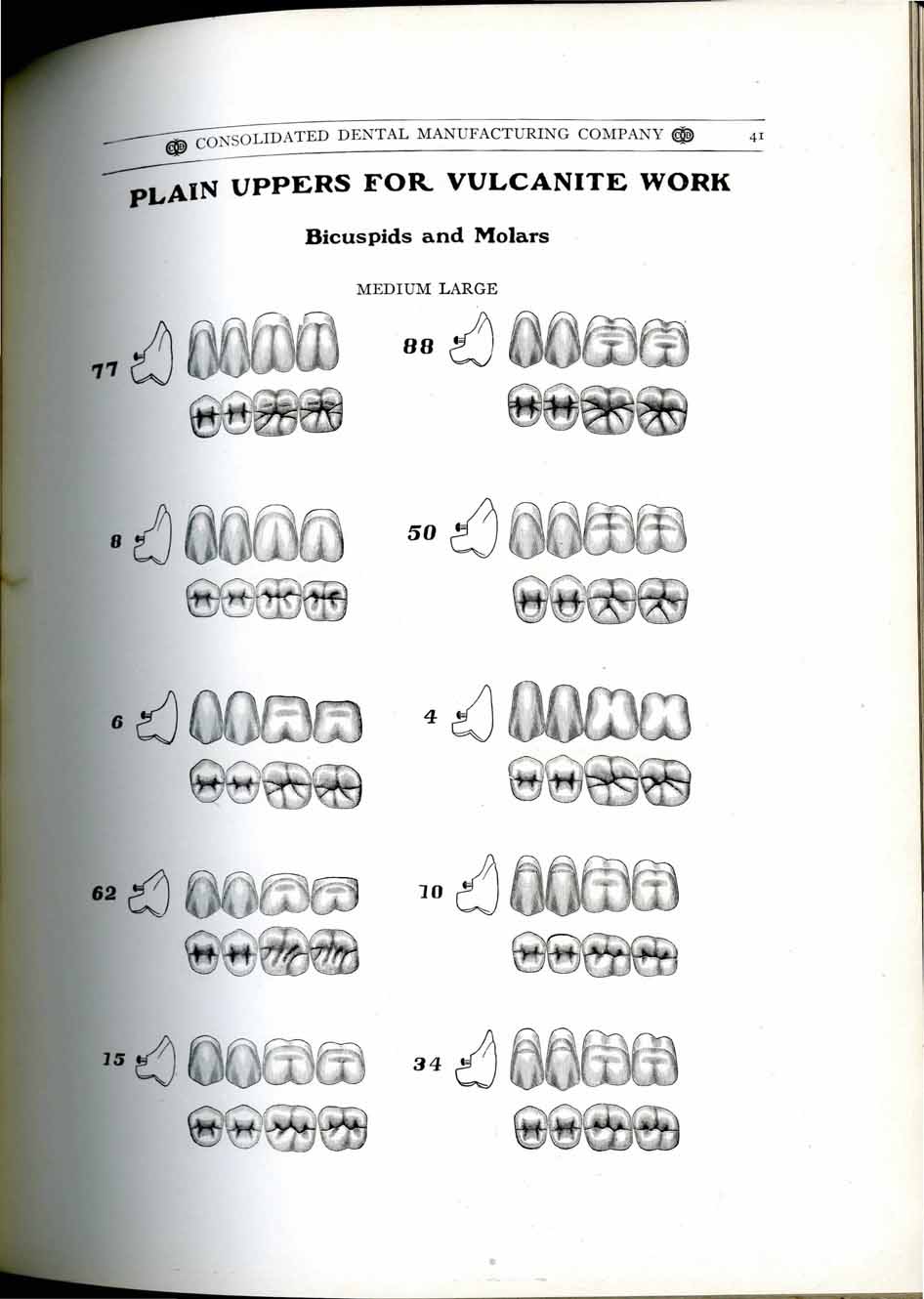 1904 catalogue of artificial teeth and Davis crowns from Consolidated Dental Manufacturing Co., including drawings, detailed descriptions, and price lists.