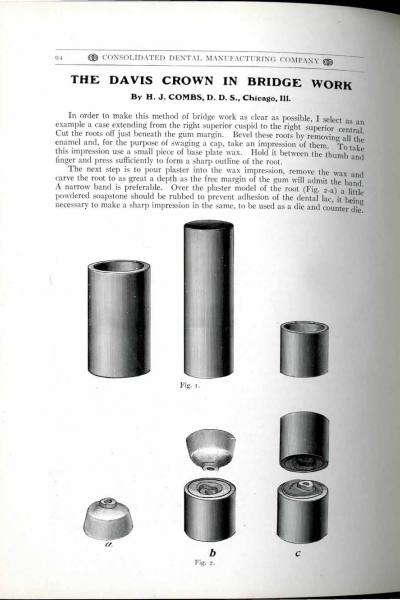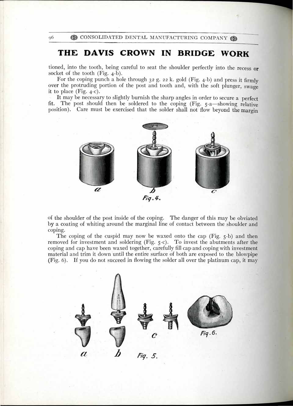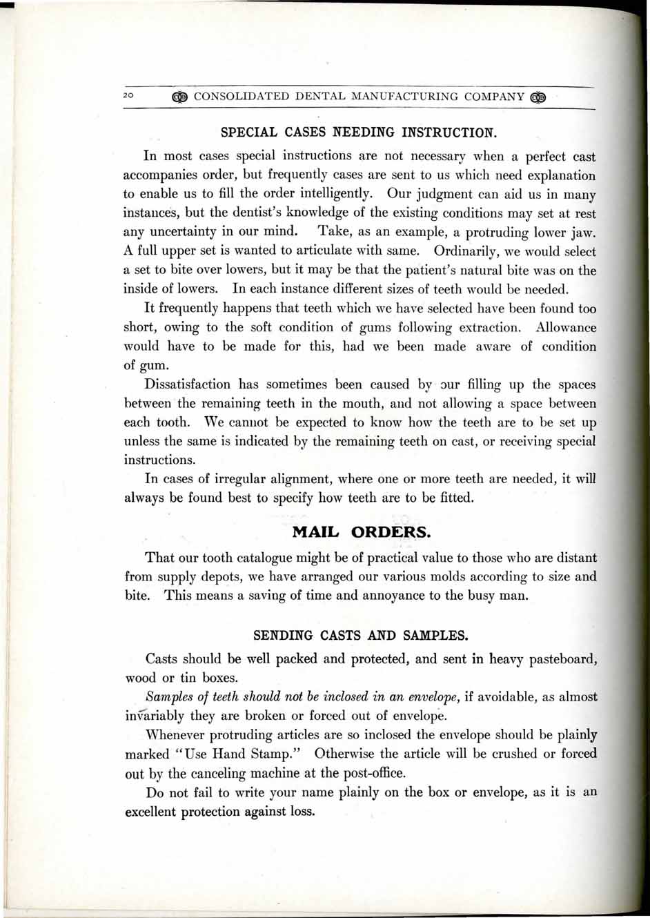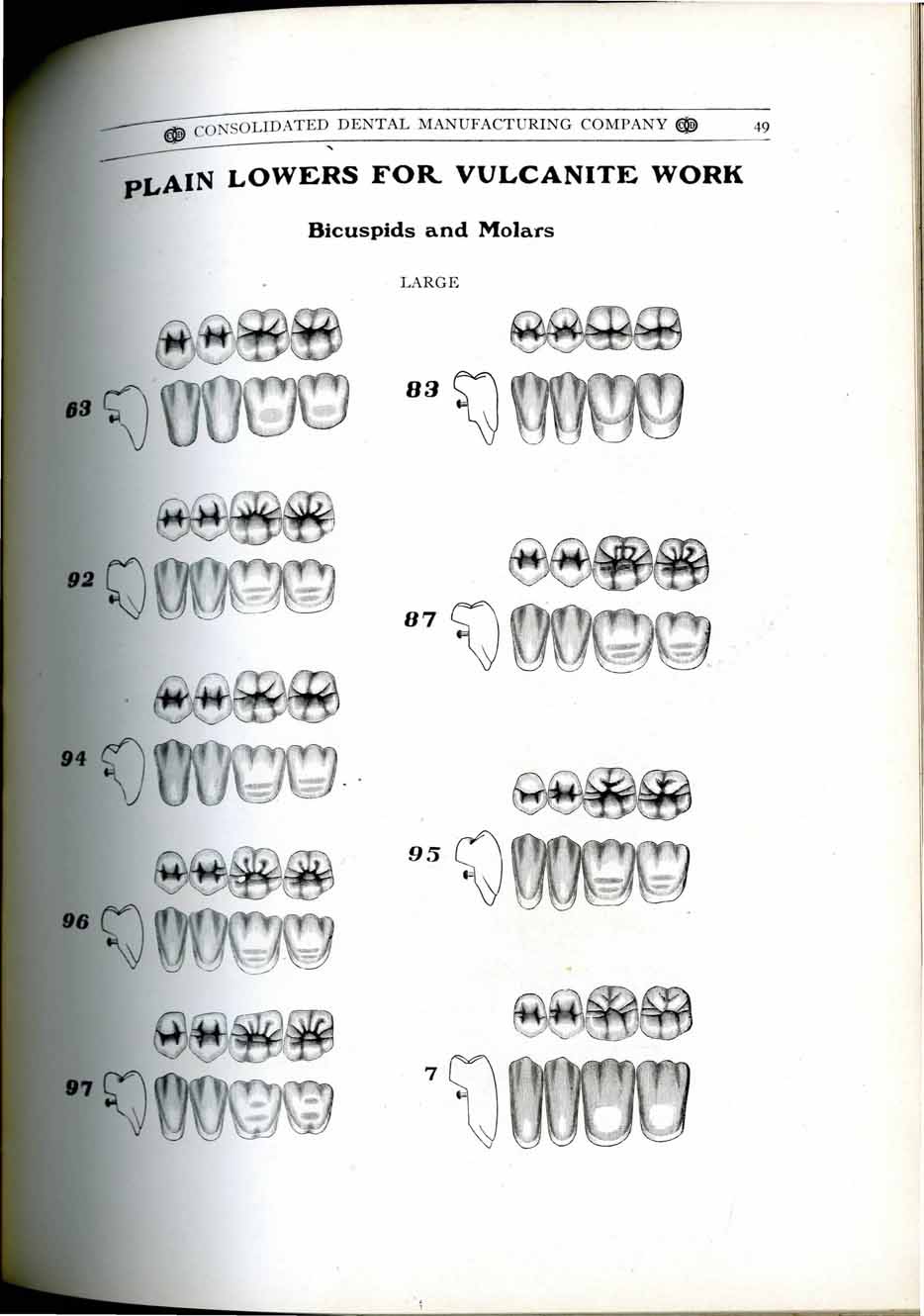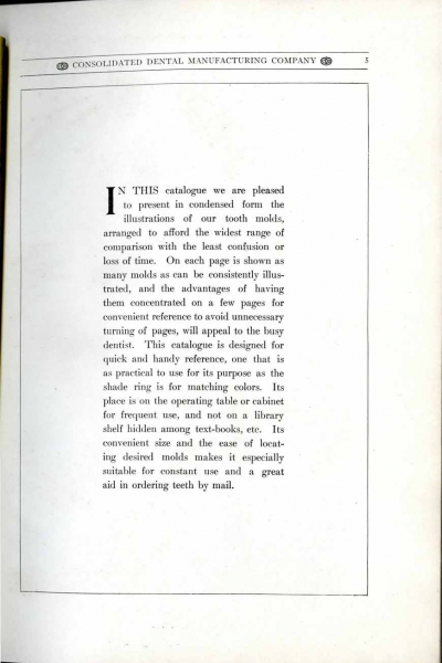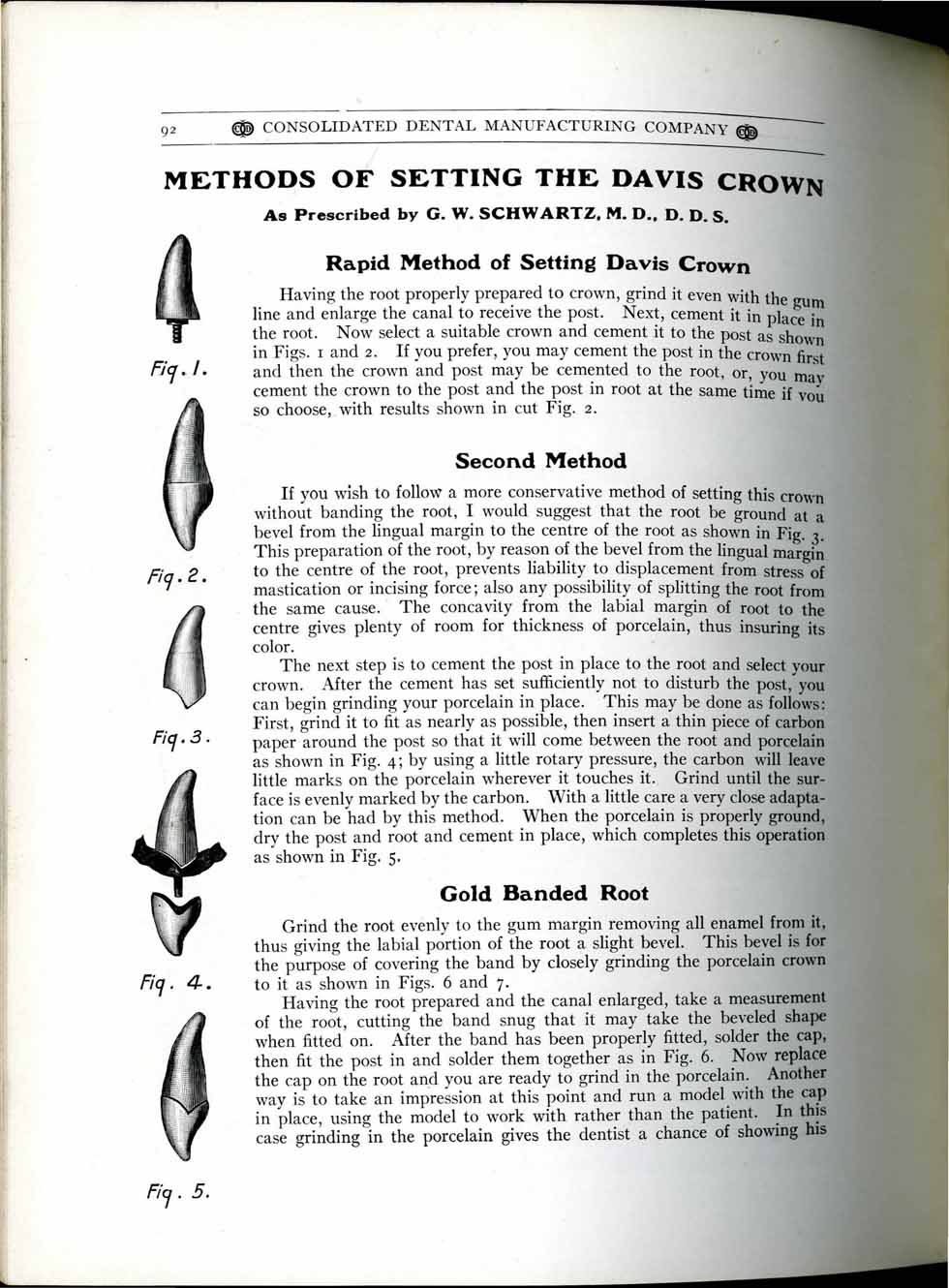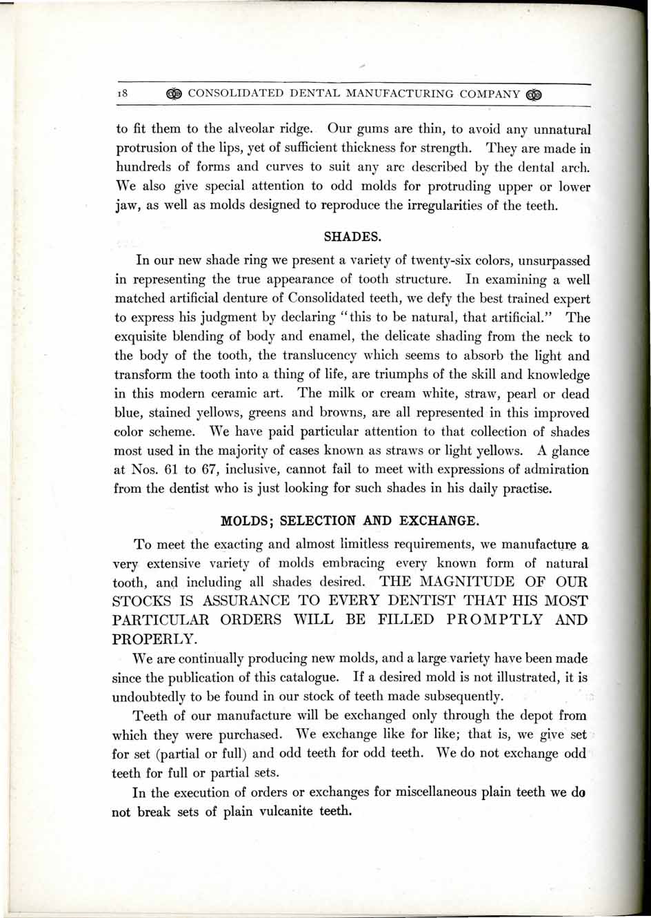 1904 catalogue of artificial teeth and Davis crowns from Consolidated Dental Manufacturing Co., including drawings, detailed descriptions, and price lists.