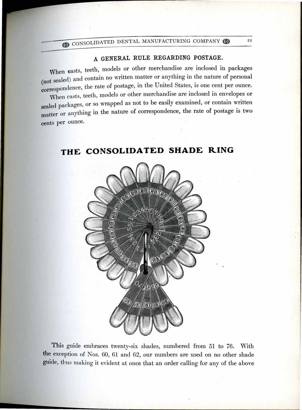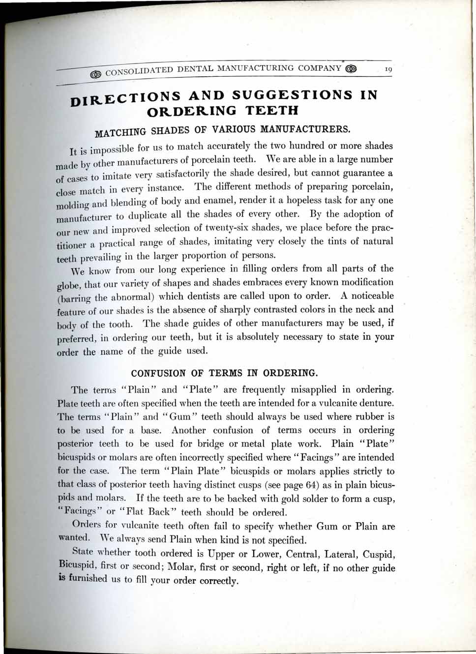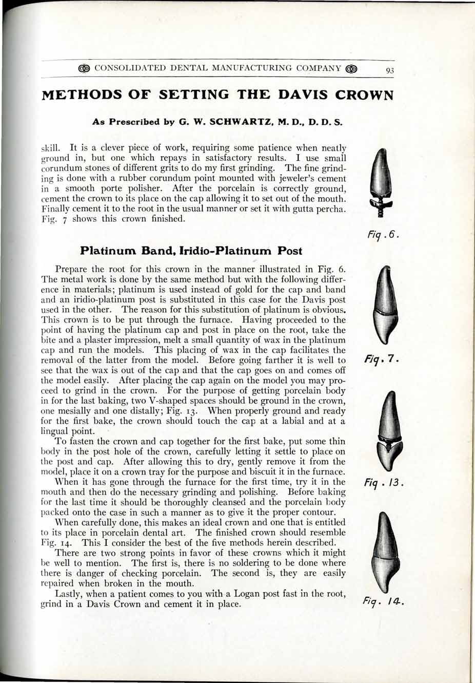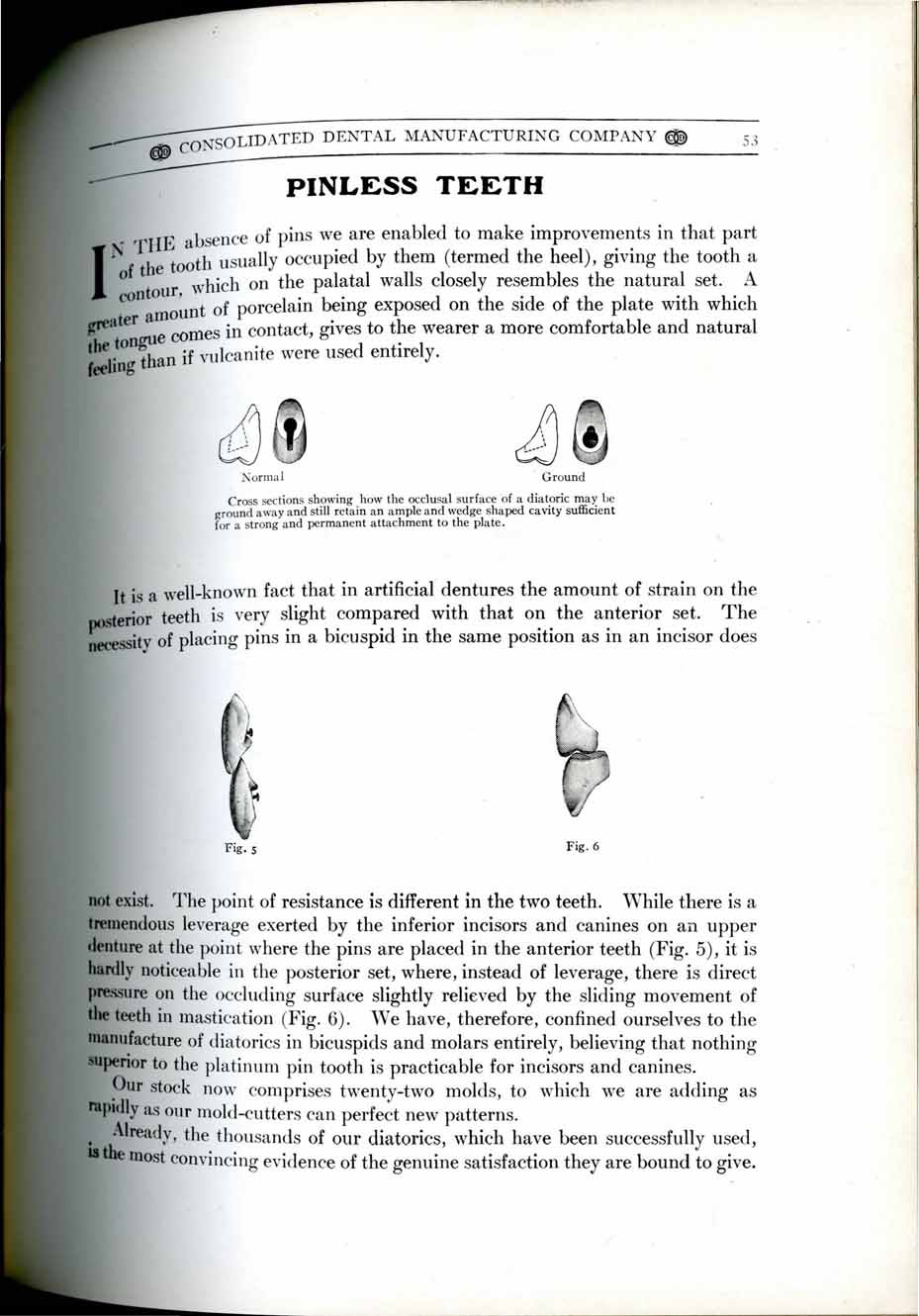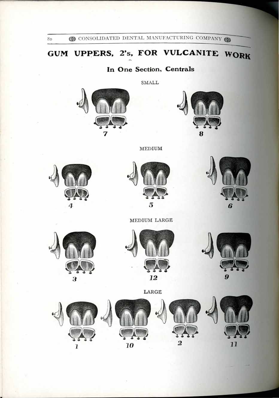 1904 catalogue of artificial teeth and Davis crowns from Consolidated Dental Manufacturing Co., including drawings, detailed descriptions, and price lists.