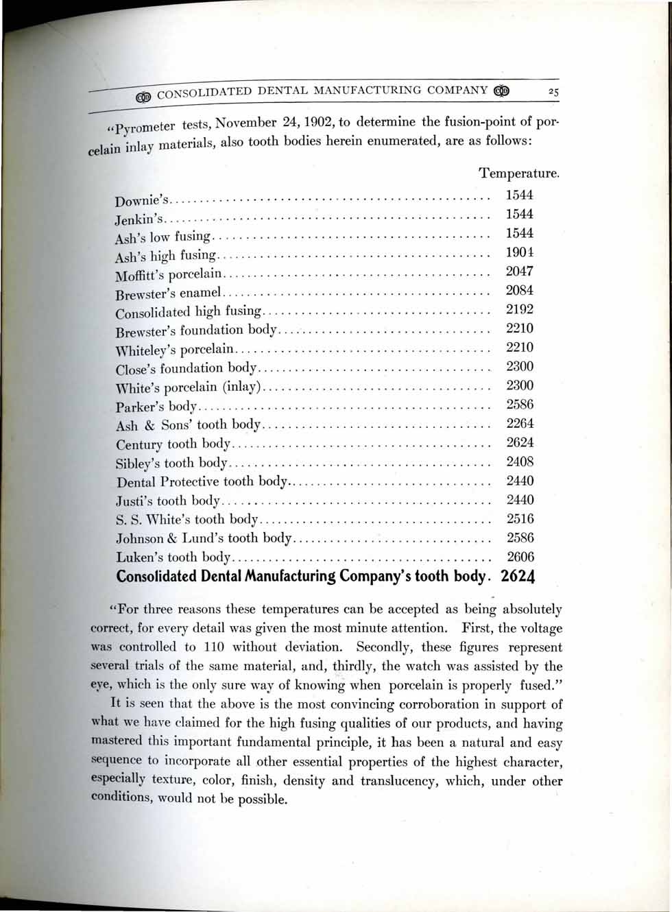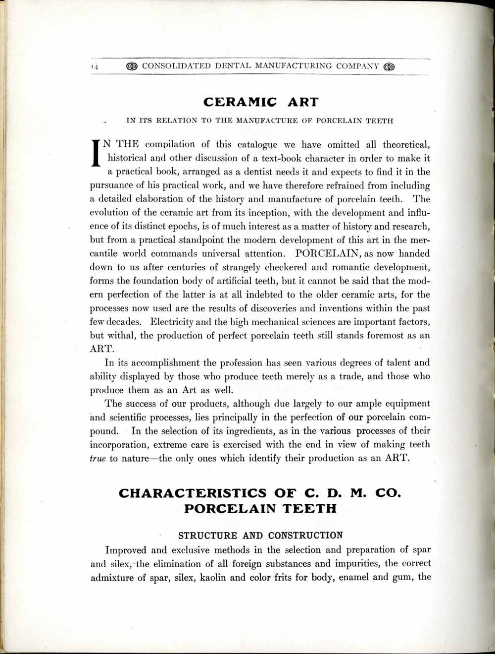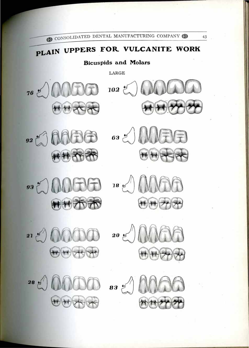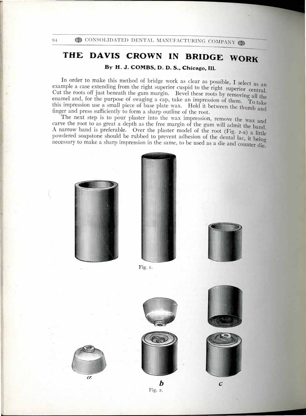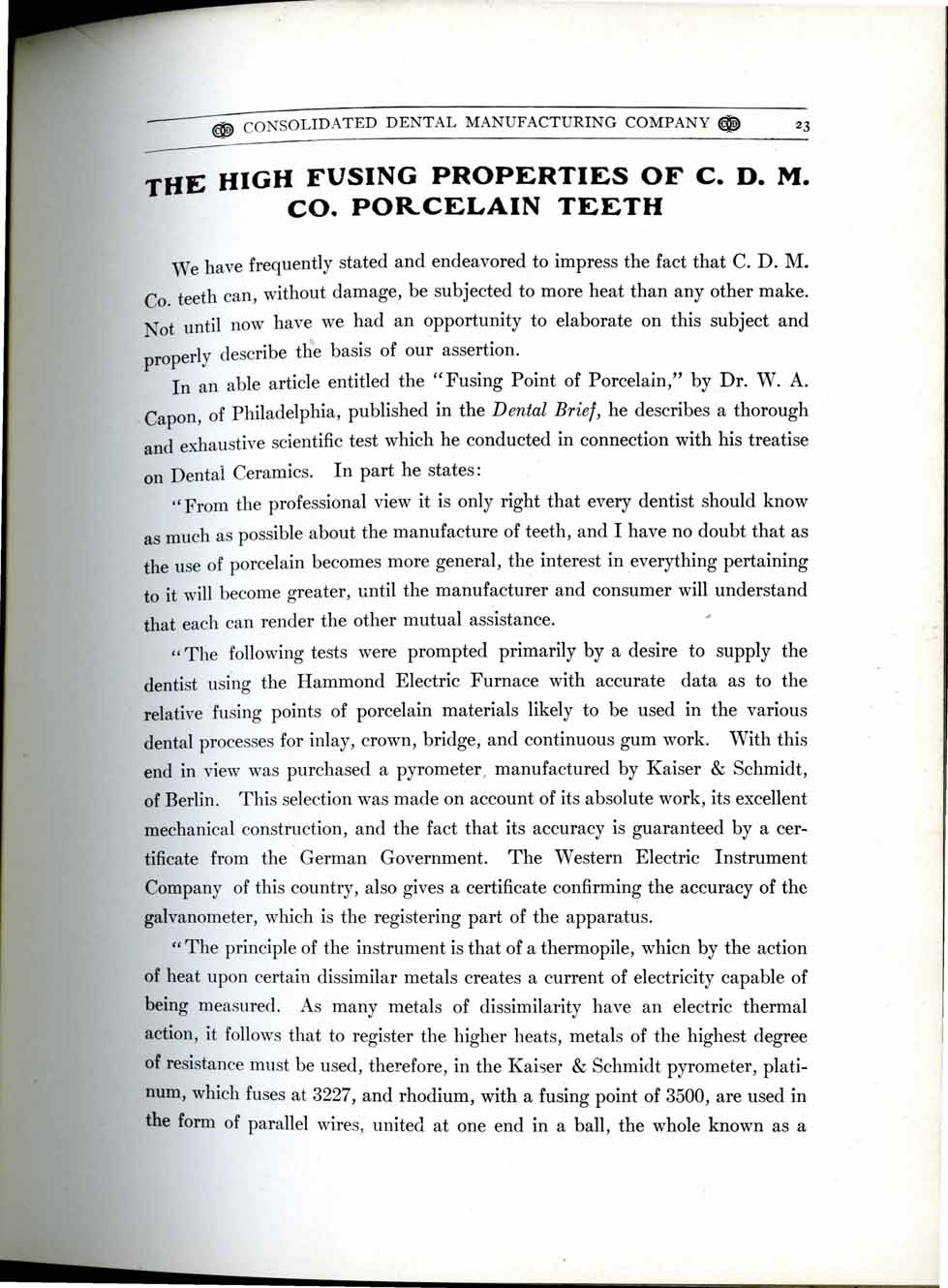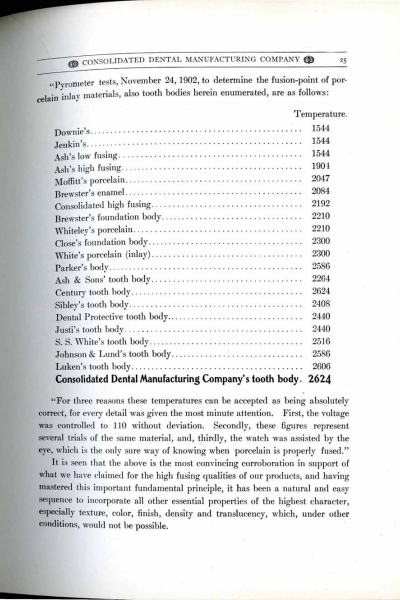 1904 catalogue of artificial teeth and Davis crowns from Consolidated Dental Manufacturing Co., including drawings, detailed descriptions, and price lists.