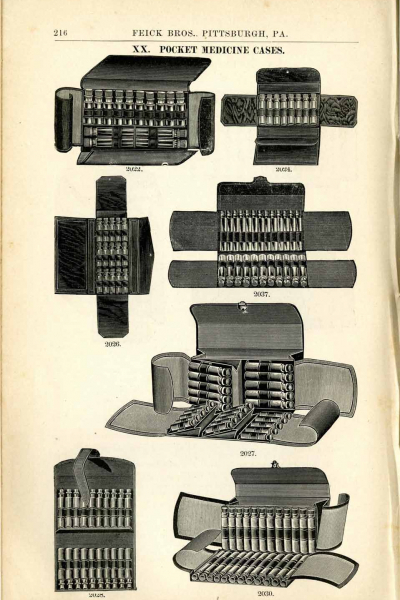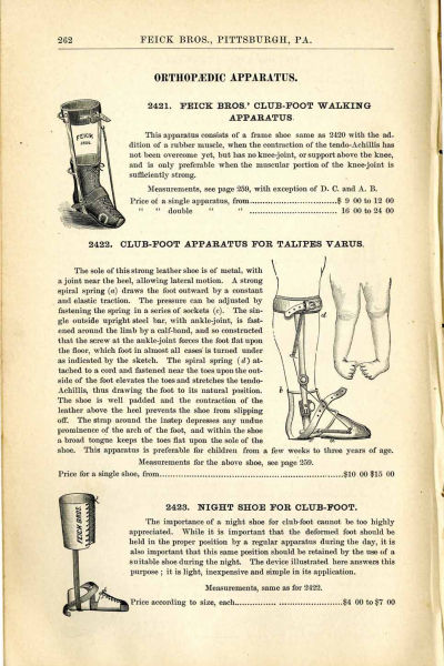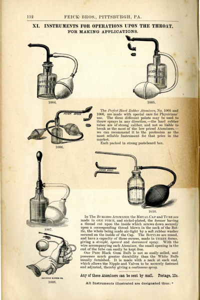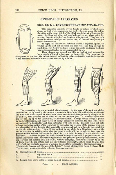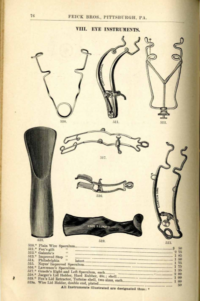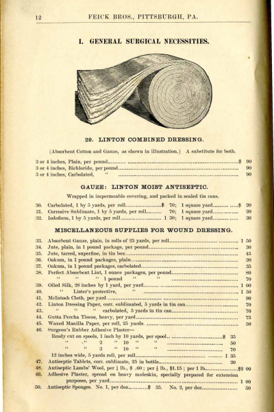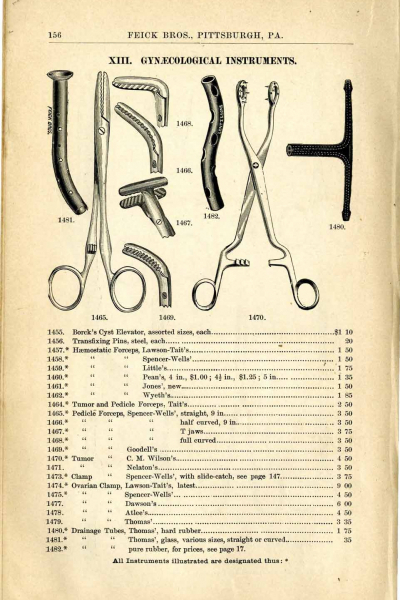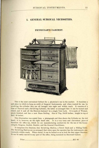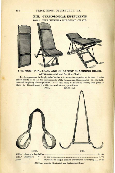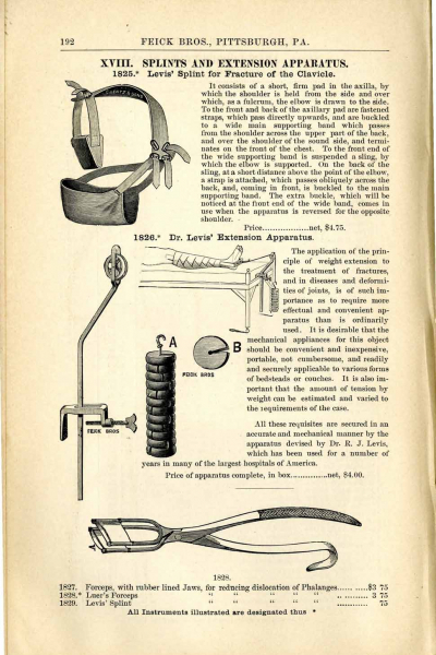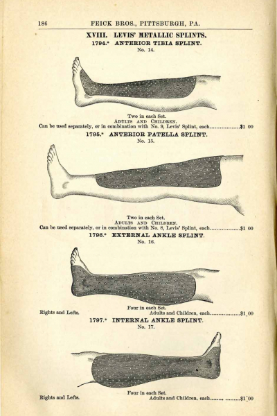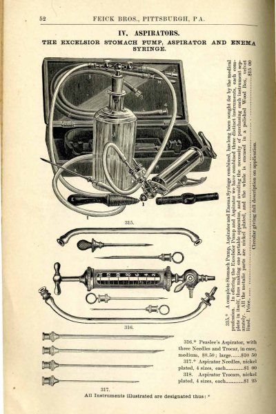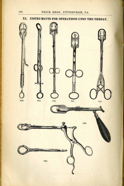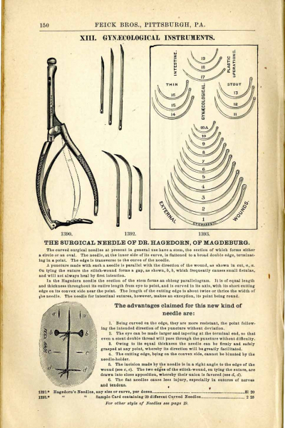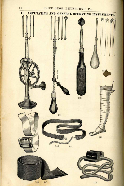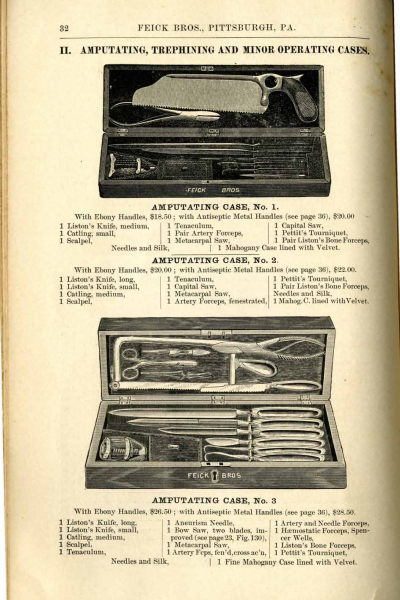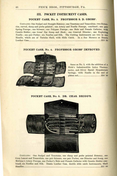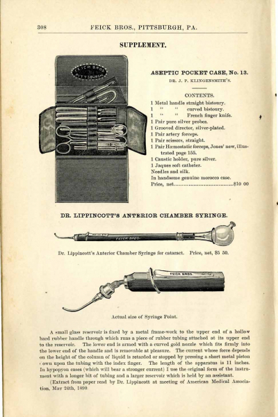 1894 catalog of surgical equipment from Feick Bros., including drawings, descriptions, prices, and advertisements.