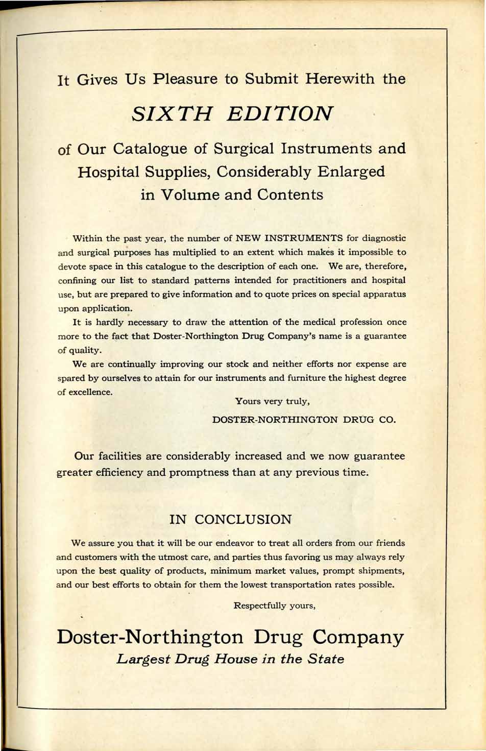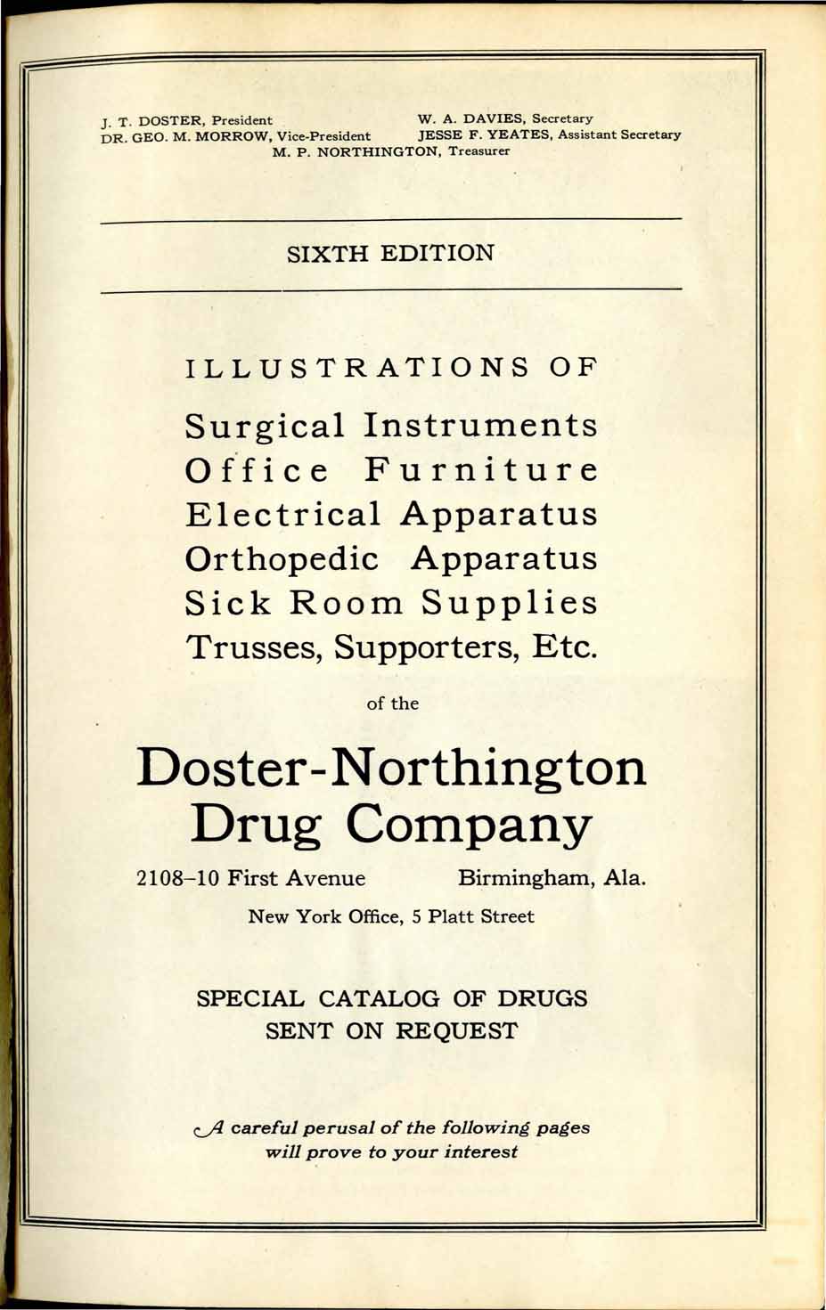 Illustrations of surgical instruments, office furniture, electrical apparatus, orthopedic apparatus, sick room supplies, trusses, supporters, etc. of the Doster-Northington Drug Company