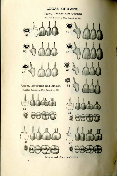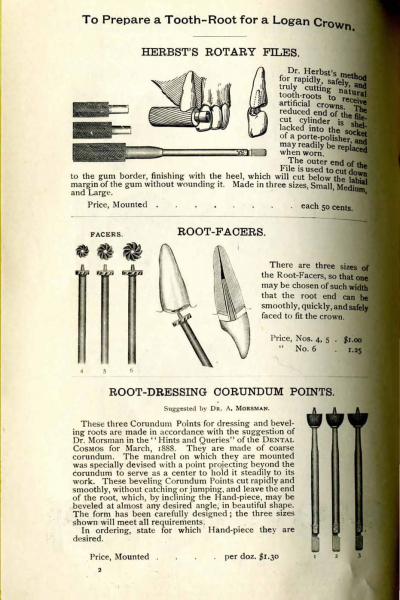 1894 catalog of materials required for mounting Logan crowns from S.S. White Dental Mfg. Co., including drawings, prices, and descriptions of various methods for mounting crowns.