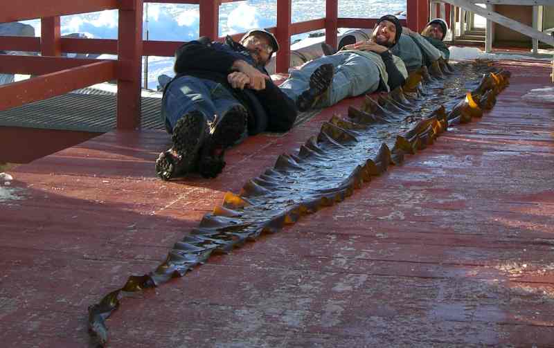 It is the browns that make up most of the forests in terms of biomass, becoming absolutely huge. One, called Himantothallus grandifolius, forms blades that can be 45-50 feet in length and nearly 3 feet wide. A photograph Maggie took of one smaller than that but still huge, which was longer than the combined height of two of my former graduate students (Craig Aumack and Philip Bucolo; both tall guys) and me is below.