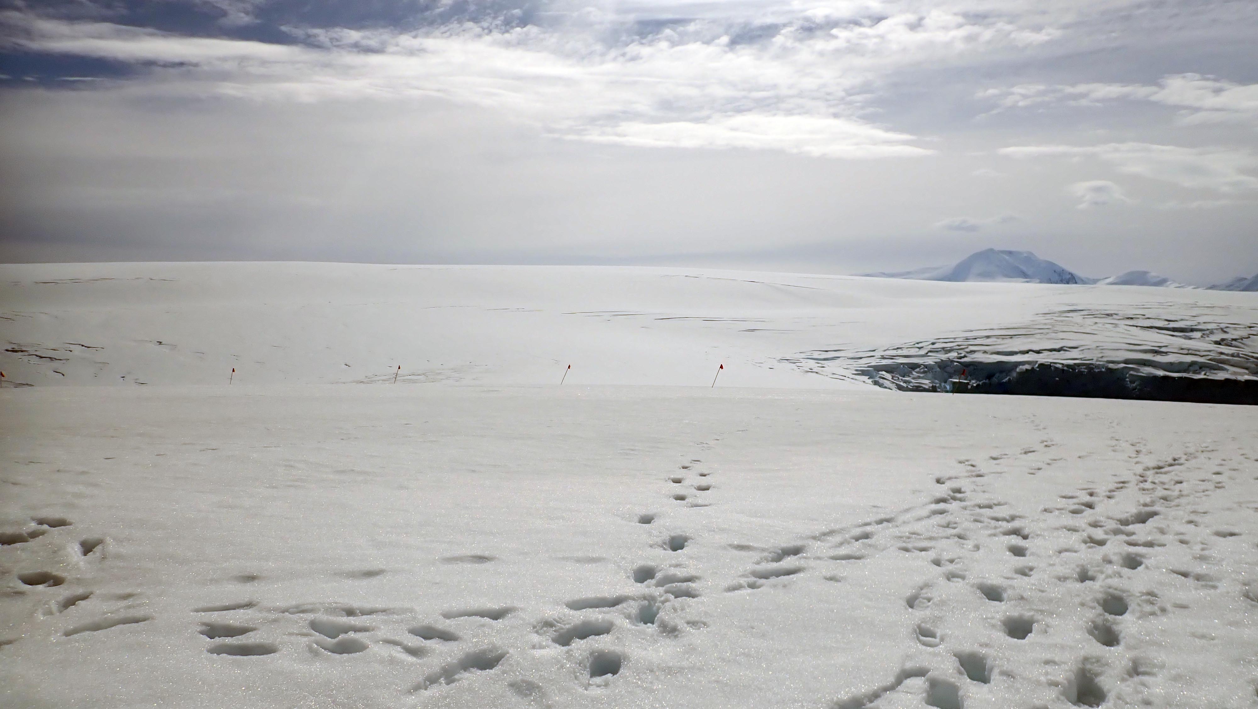 Continuing up the glacier, the slope flattens once the wide plateau of this polar piedmont is reached. Beneath my feet and before my eyes is the expanse of the Marr Glacier. The many deep boot prints in the snow proof that I was not the first to visit the plateau. The flags mark the end of the safe, crevasse-free zone. Far beyond that flagline is Mount Francais, at 9500 ft elevation it is the highest peak on Anvers Island.