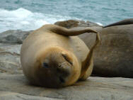 These animals are the largest seals on earth- the males can weigh up to 4 tons. They spend most of their time in the water foraging for food (mainly squid) and dive hundreds of meters into the ocean to do this. But we only see the elephant seals when they have hauled out onto the rocks. On land they are not very graceful - every move seems a great effort to them. They pause for a while then heave themselves up and plonk themselves down with wobbling bodies just a little bit further along- so moving on land is pretty slow compared to how graceful they are underwater.