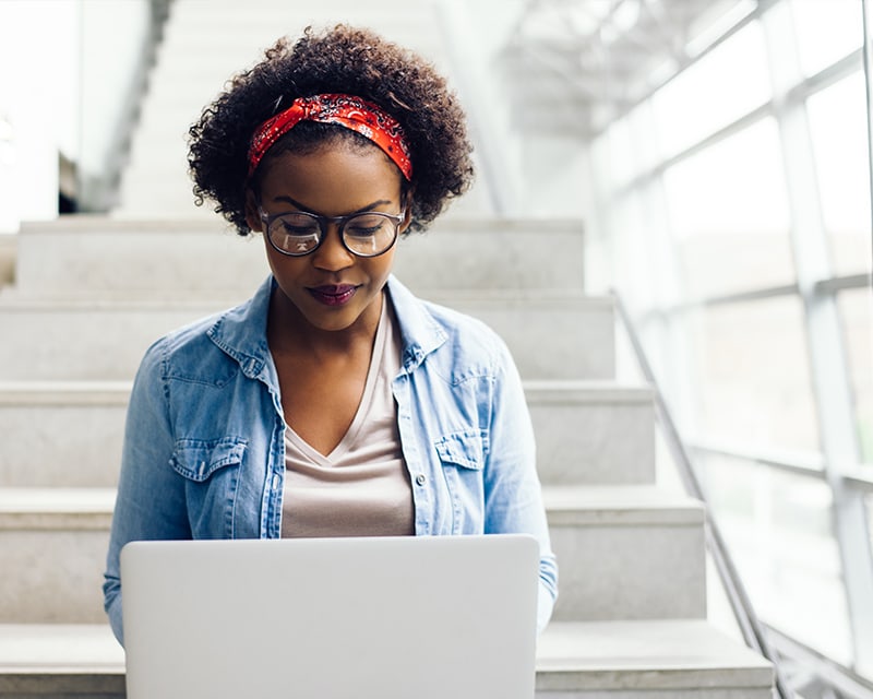 Student wearing glasses and a red headband, sitting on astairs and working on her laptop. The Honors Program in African American Studies (AAS) has been designed to: