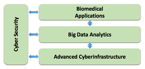 Our research is organized into multiple core clusters: Cyber Security, Biomedical Computing, Artificial Intelligence and Data Science, AI Research and Collaboration, and Advanced Cyberinfrastructure (IoT, Cloud).