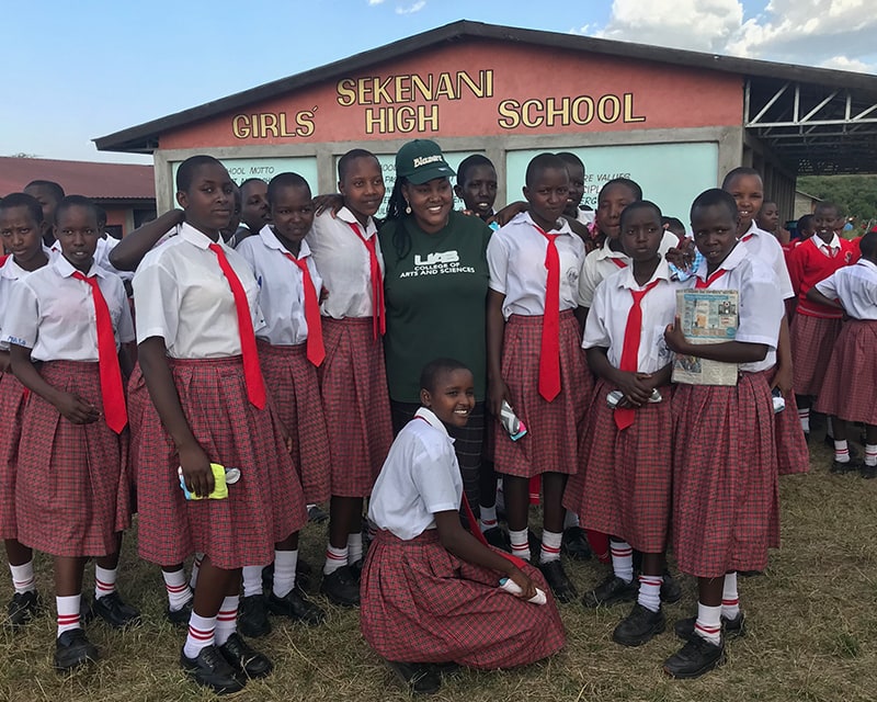 Photo caption: IHR local collaborator and coordinator of Nashulai Maasai Conservancy Women’s and Girls’ Empowerment Initiative Maggie Reiyia with girls of Sekenani Girls High School