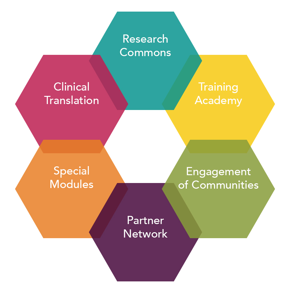 So glad you asked! CCTS offers so many resources and supports for faculty, clinician-scientists, trainees, students, staffresearch professionals, and community members, even we had trouble keeping them straight. So we organized them into six administrative domains to help in navigation. Click on the plus signs in the hexagons below to learn more.