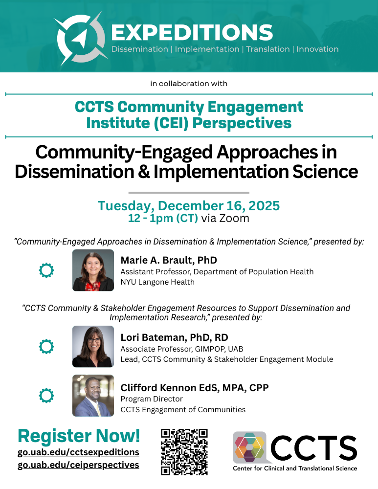 Join us for a special edition of CEI Perspectives in collaboration with the CCTS ExpeDITIons Forum. This session will spotlight tools, strategies, and real-world examples of community and stakeholder engagement to support dissemination and implementation (D&I) research. Featured speakers include Dr. Marie Brault (NYU Langone Health), Dr. Lori Bateman (CCTS, UAB), and Clifford Kennon (CCTS Engagement of Communities).