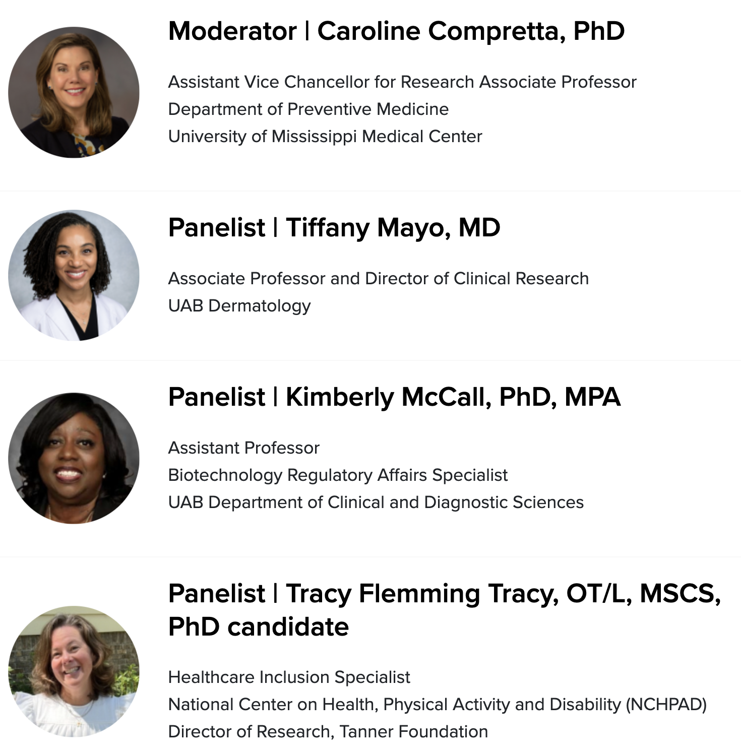 - Kimberly McCall, PhD, MPA, Assistant Professor and Biotechnology Regulatory Affairs Specialist, UAB Clinical and Diagnostic Sciences