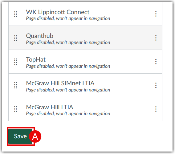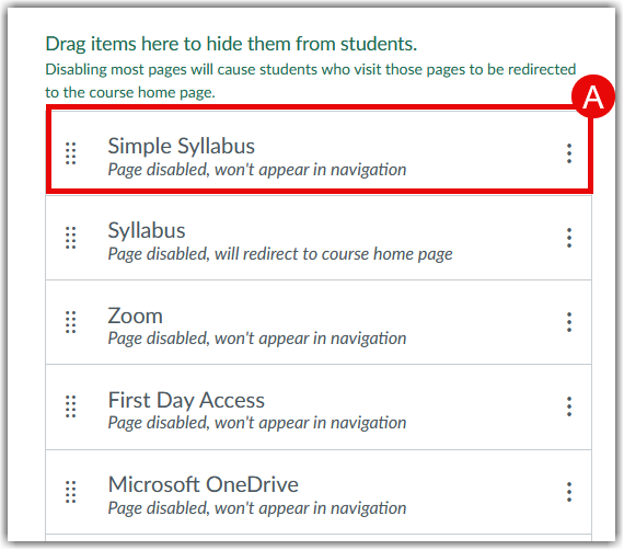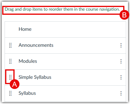 - Click the vertical, parallel sequence of dots next to Simple Syllabus (A), and drag the rectangle to the top column of items located under the text Drag and drop items to reorder them in the course navigation (B).