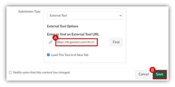 - Scroll down until the Submission Type box is visible. Place your cursor in the text field below Enter or find an External Tool URL (A). Update the text to read: https://lti.goreact.com/lti/v1.