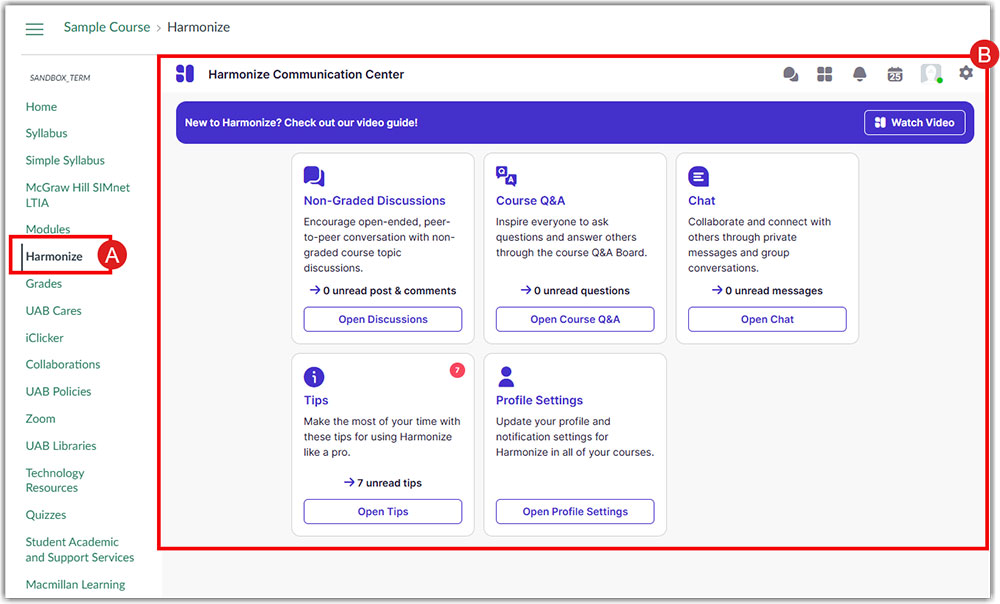 Once you are in your desired course, select Harmonize (A) from the left-hand course navigation menu. You will arrive at the Harmonize Communication Center (B). From here you will be able to access the class discussion, review the course Q&A, connect with others via the Harmonize chat, view pro tips, and update your profile and notification settings for Harmonize.