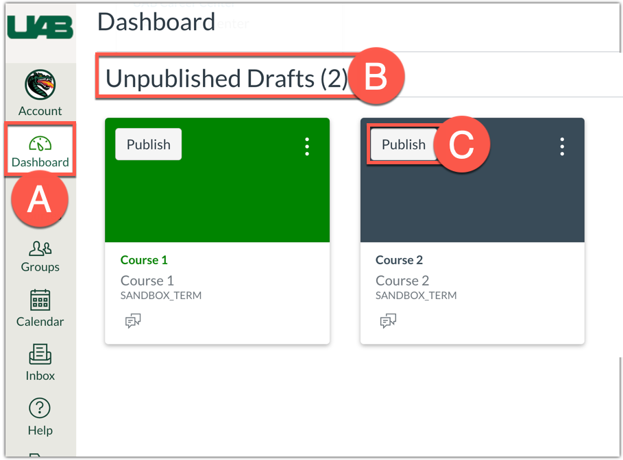 Login to Canvas and click Dashboard (A) in the global navigation on the left. Scroll down to locate the Unpublished Drafts (B) section in the Dashboard. Find the course you want to publish and click the Publish (C) button.