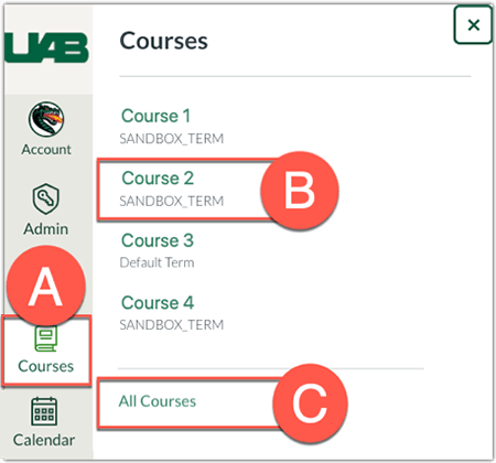 In Global Navigation on the left, click the Courses (A) link, then click the desired course (B). If you do not see the desired course in this list, click All Courses (C) to see the full list.