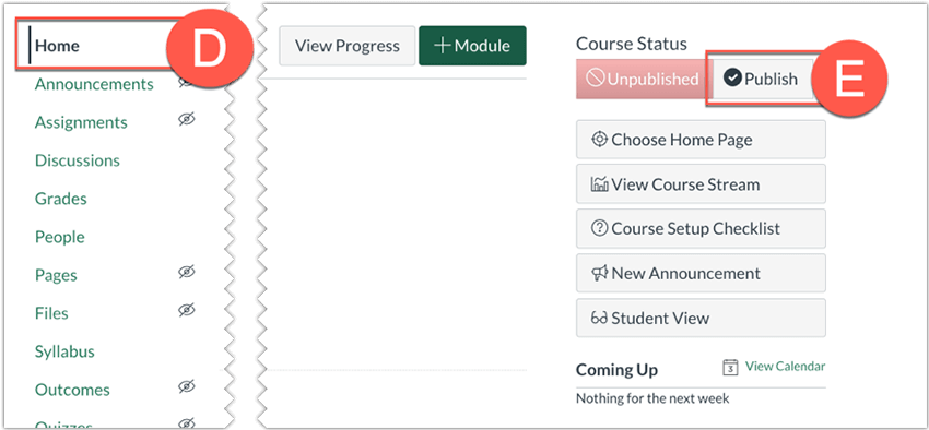 From the Home (D) page of the course, click the Publish (E) button in the right sidebar. Note: On smaller screens, the Sidebar displays beneath Course Home Page content (at the bottom).