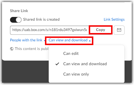 - Hover your mouse over the file or folder of files in UAB Box opens a new website and click the Chain Link icon.