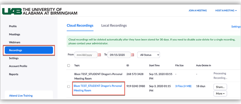 - Click Recordings on the left and click the title of the desired Meeting.