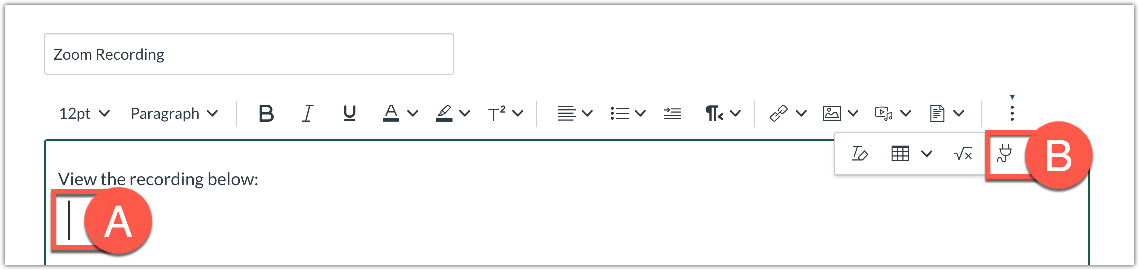 - Navigate to desired location in Canvas (page, assignment, discussion, announcement, or quiz.) and put the cursor in the desired location (A).