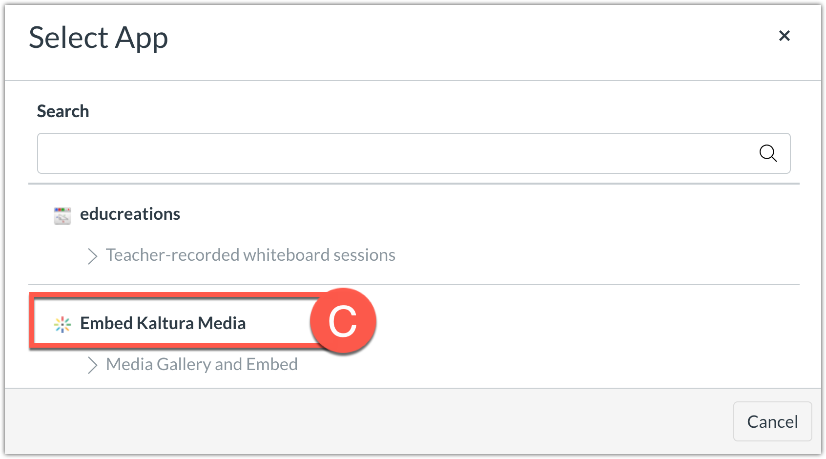 - Click the logo beside Embed Kaltura Media (C).