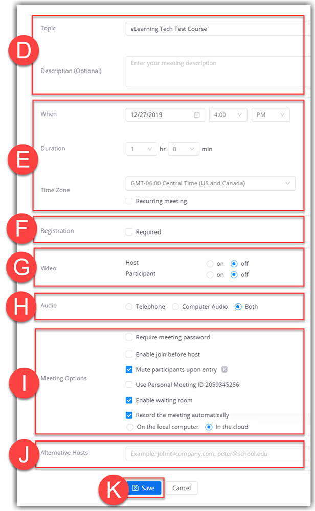 - Enter or modify the Topic and Description (D) for the meeting. Only the topic will be visible to all attendees.