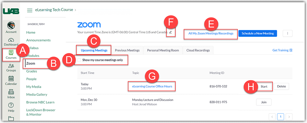 - Click All My Zoom Meetings/Recordings (E) to see all Zoom meetings including meetings scheduled outside of this course.