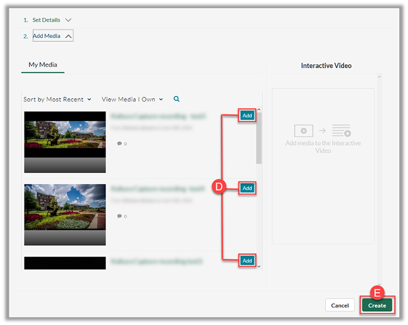 - Locate your desired media and select Add (D) on each video you would like to add to the Interactive Video Path.