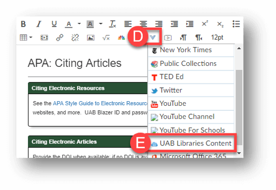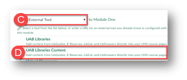 4. Scroll down, click UAB Libraries Content (D).