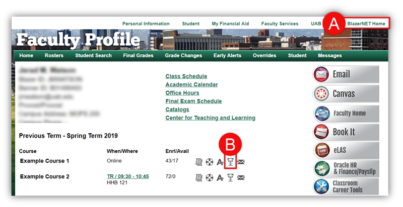 - Click BlazerNET Home (A) at the top right, if not already on the faculty profile page.