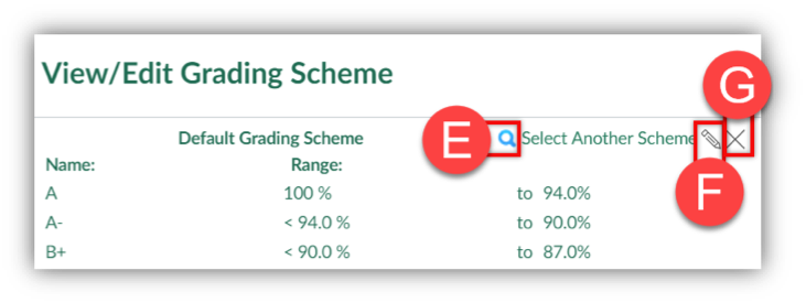 - Click the Pencil (E) icon at the top right to edit the currently selected grading scheme or click Select Another Scheme (F) to choose a grading scheme created at the account or course level. Click the X (G) to unlink from the current grading scheme and start over with the Canvas default.