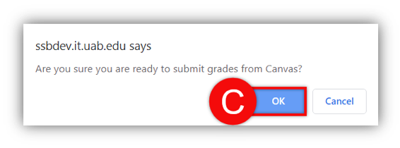 - Click OK (C) in the dialog box that pops up. This just pulls grades from Canvas to Banner. You will be able to verify and revise grades before actually submitting grades.