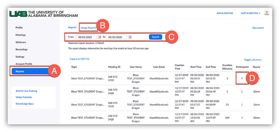 - Locate the desired meeting and click the blue number of participants (D) to pull up the report. Note: You may need to scroll to the right to see the participants column that shows the blue clickable number.