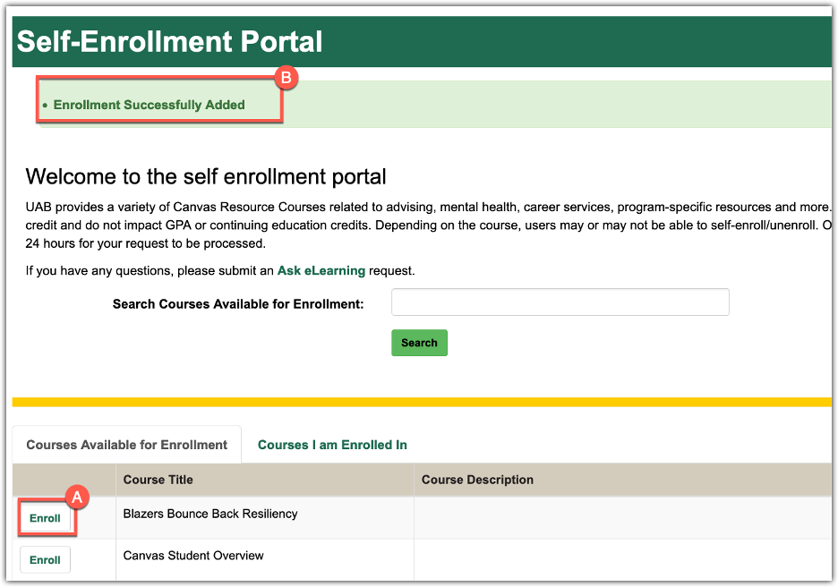 - The Self-Enrollment Portal defaults to Courses Available for Enrollment. To enroll in a course, select Enroll (A) next to the course name. A banner (B) will appear to indicate your successful enrollment.