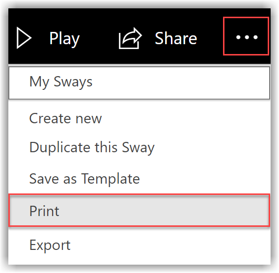 To print your Sway, go to the … menu in the top right and select Print. Sway creates a PDF that you can print for paper viewing. Print is handy for presentation notes, as well as handouts for meetings and classrooms.