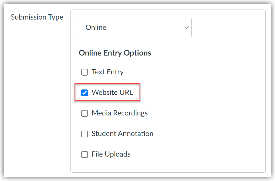 Instructors can create a Canvas assignment opens a new website and enable Website URL as an Online Entry option.